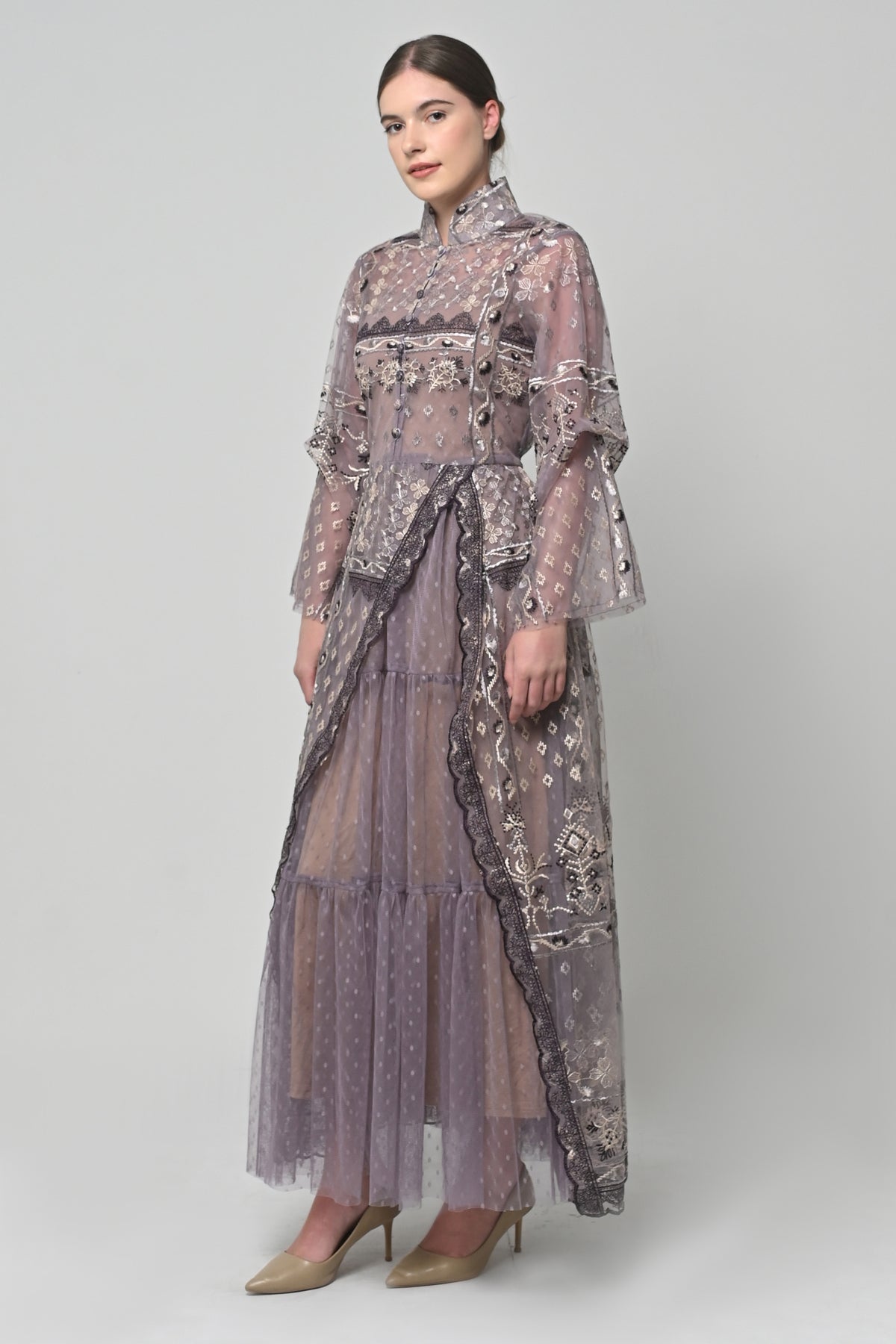 The Ozmera Dress features an elegant layered A-line silhouette with a distinctive front overlap that creates a graceful wrap effect. The high neckline and structured bodice give a polished impression, balanced by flared bell sleeves that add fluidity and movement. Its sheer outer layer, adorned with silver embroidery, contrasts beautifully with the warm nude inner layer, creating depth and visual softness. The tiered tulle skirt beneath enhances the sense of lightness, allowing the dress to flow effortlessly with every motion.