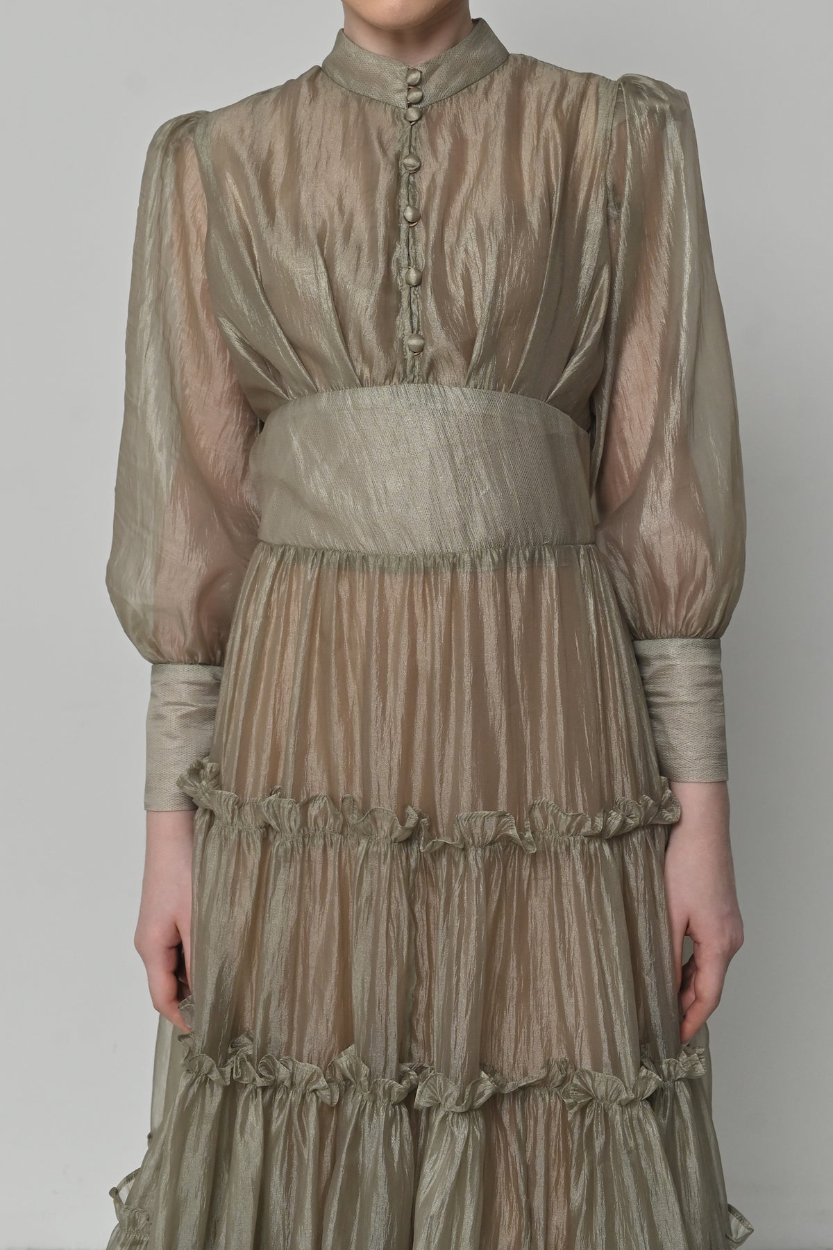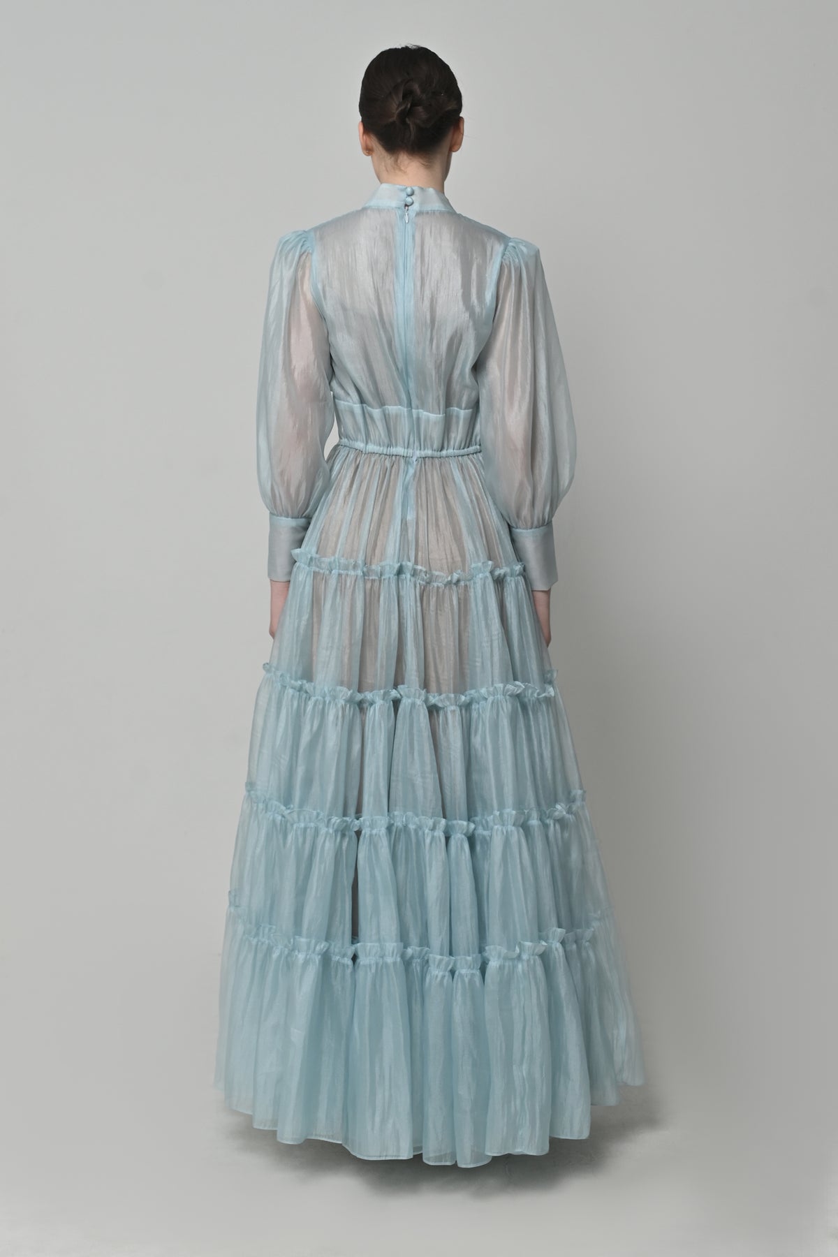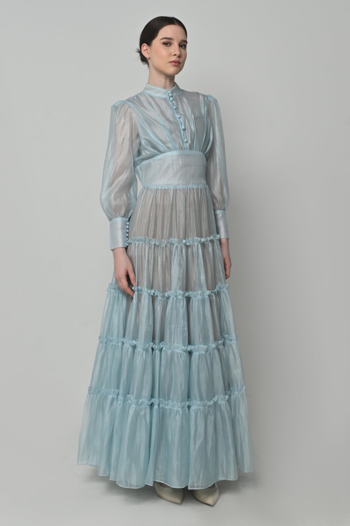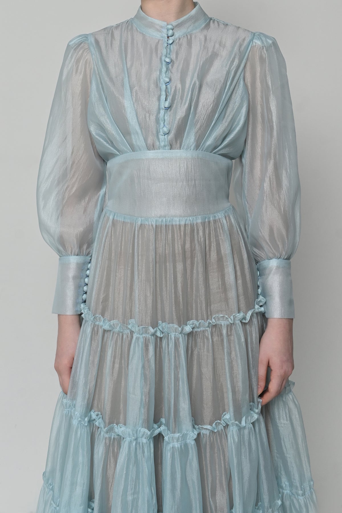 The Lalita Dress is a captivating blend of vintage charm and modern structure, presented in a shimmering, ice-blue organza fabric. This ethereal piece features a sophisticated obi-style waistband that elegantly defines the silhouette, separating a structured bodice from its flowing lower half. The design is characterized by its long sleeves with prominent cuffs, detailed with delicate buttons and built-in padding at the shoulders to create a sharp, regal posture. Completing the look is a magnificent frilled tiered skirt, where layers of ruffled organza add voluminous movement and a touch of whimsical grace.