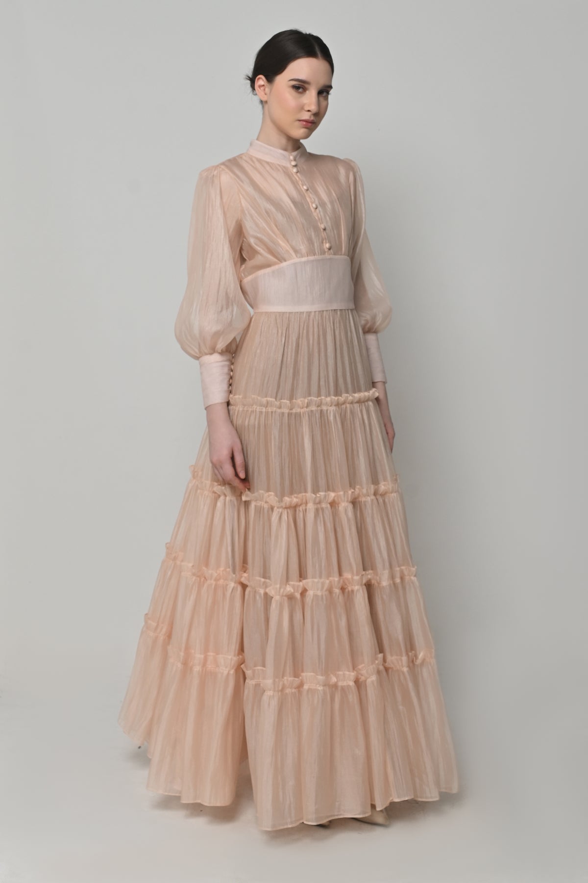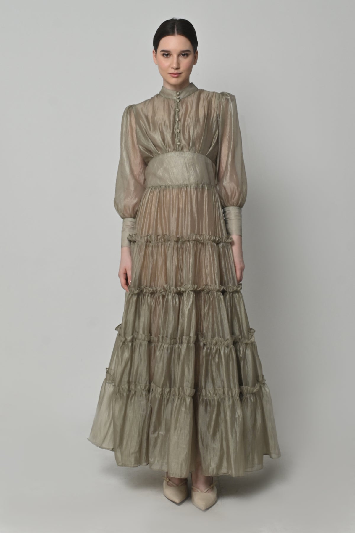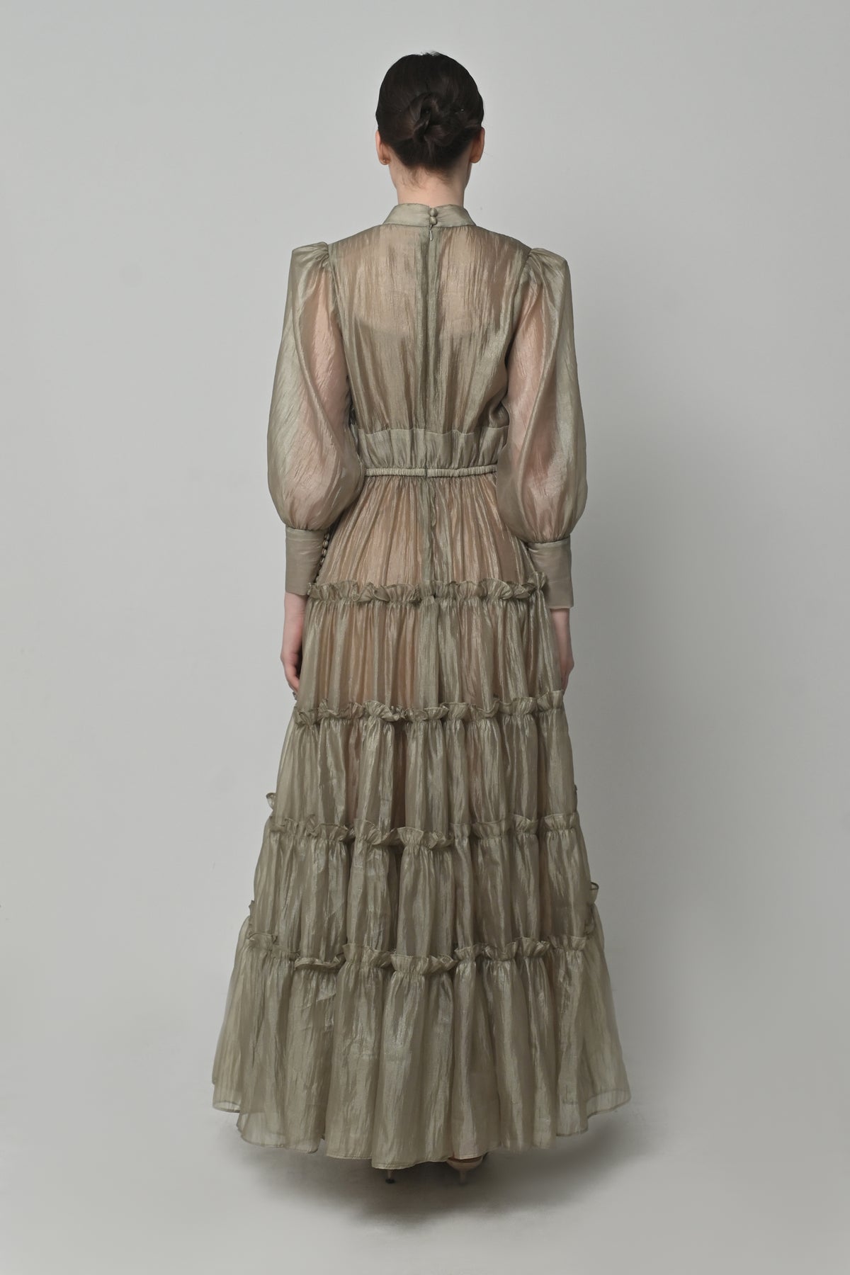 The Lalita Dress is a captivating blend of vintage charm and modern structure, presented in a shimmering, ice-blue organza fabric. This ethereal piece features a sophisticated obi-style waistband that elegantly defines the silhouette, separating a structured bodice from its flowing lower half. The design is characterized by its long sleeves with prominent cuffs, detailed with delicate buttons and built-in padding at the shoulders to create a sharp, regal posture. Completing the look is a magnificent frilled tiered skirt, where layers of ruffled organza add voluminous movement and a touch of whimsical grace.