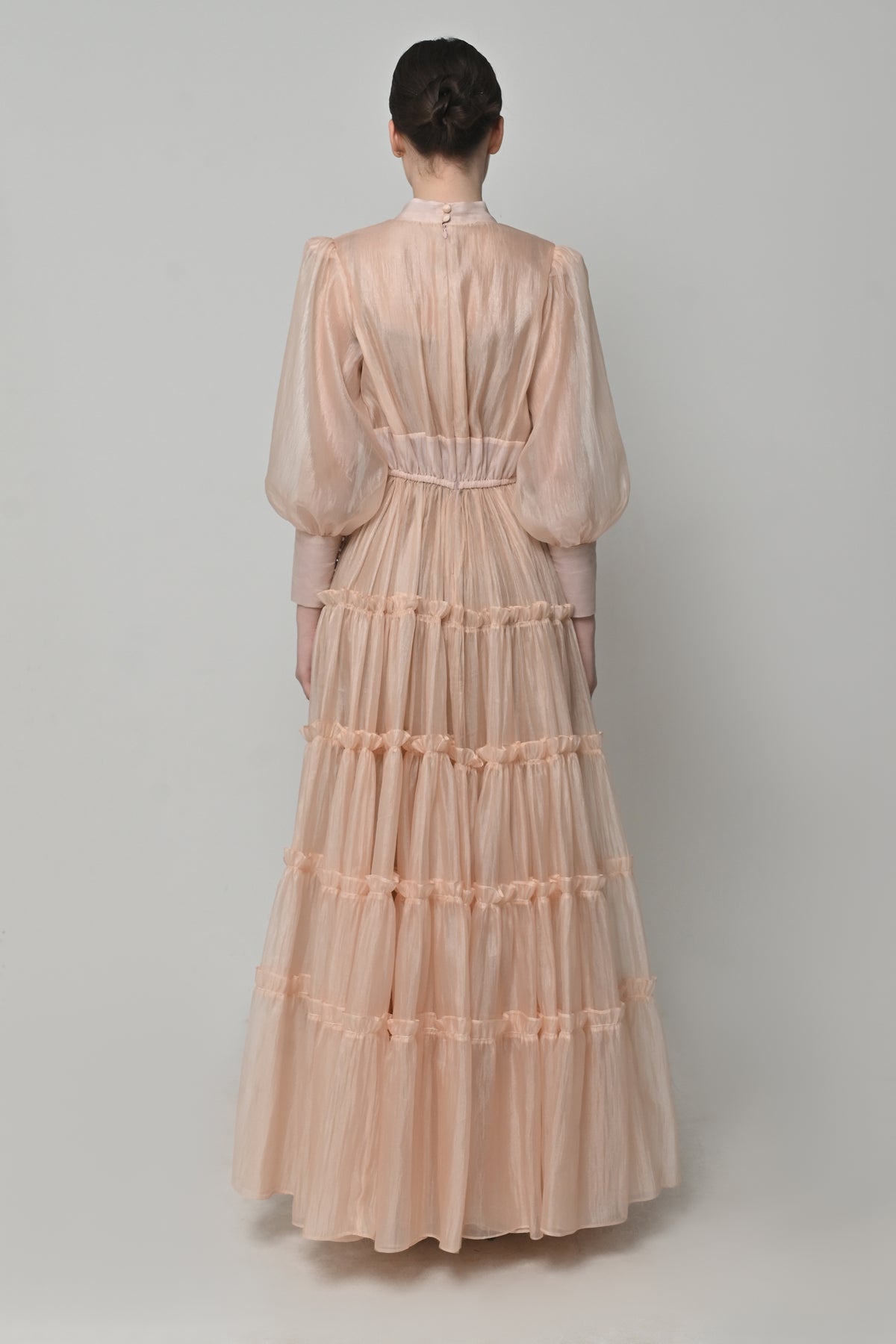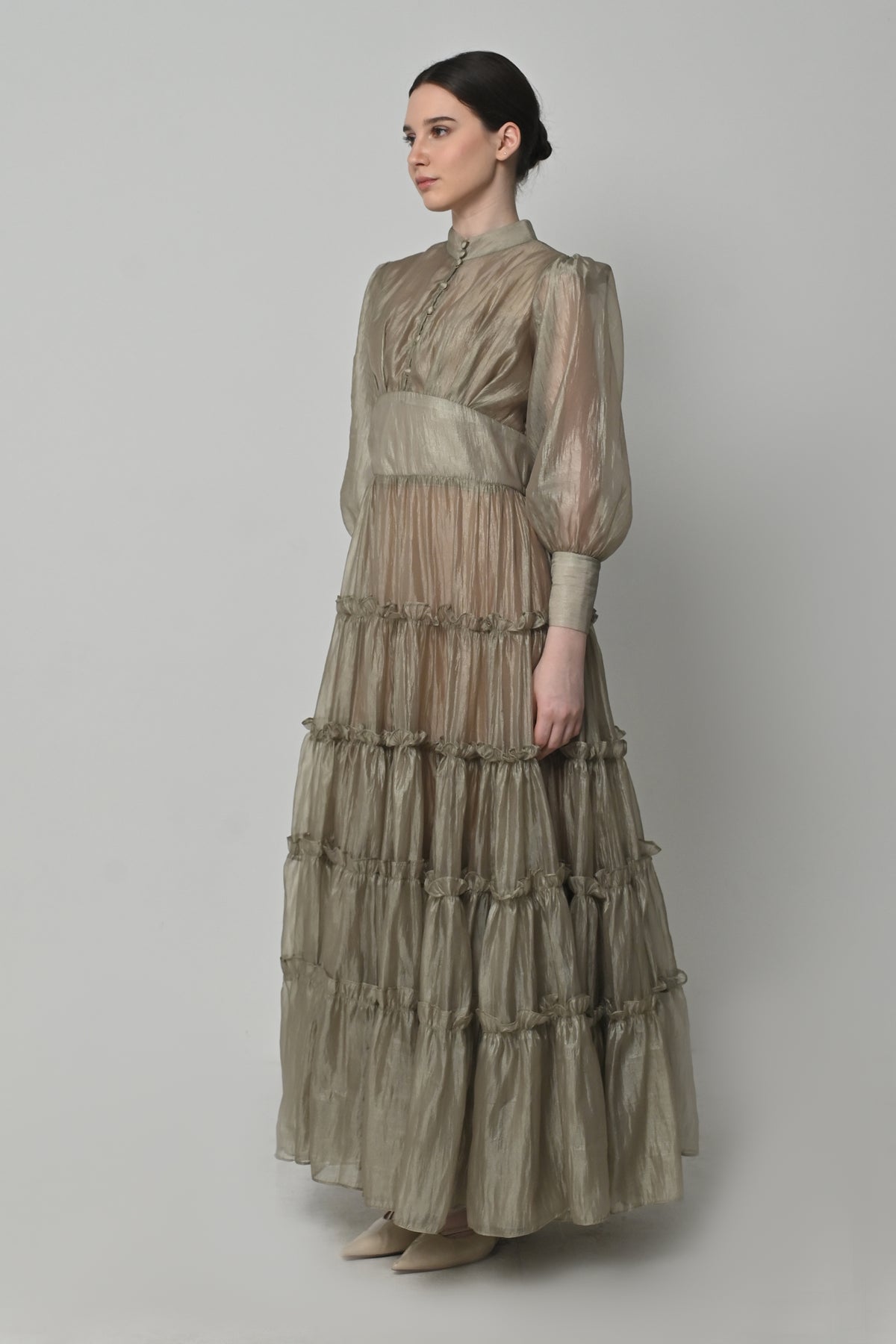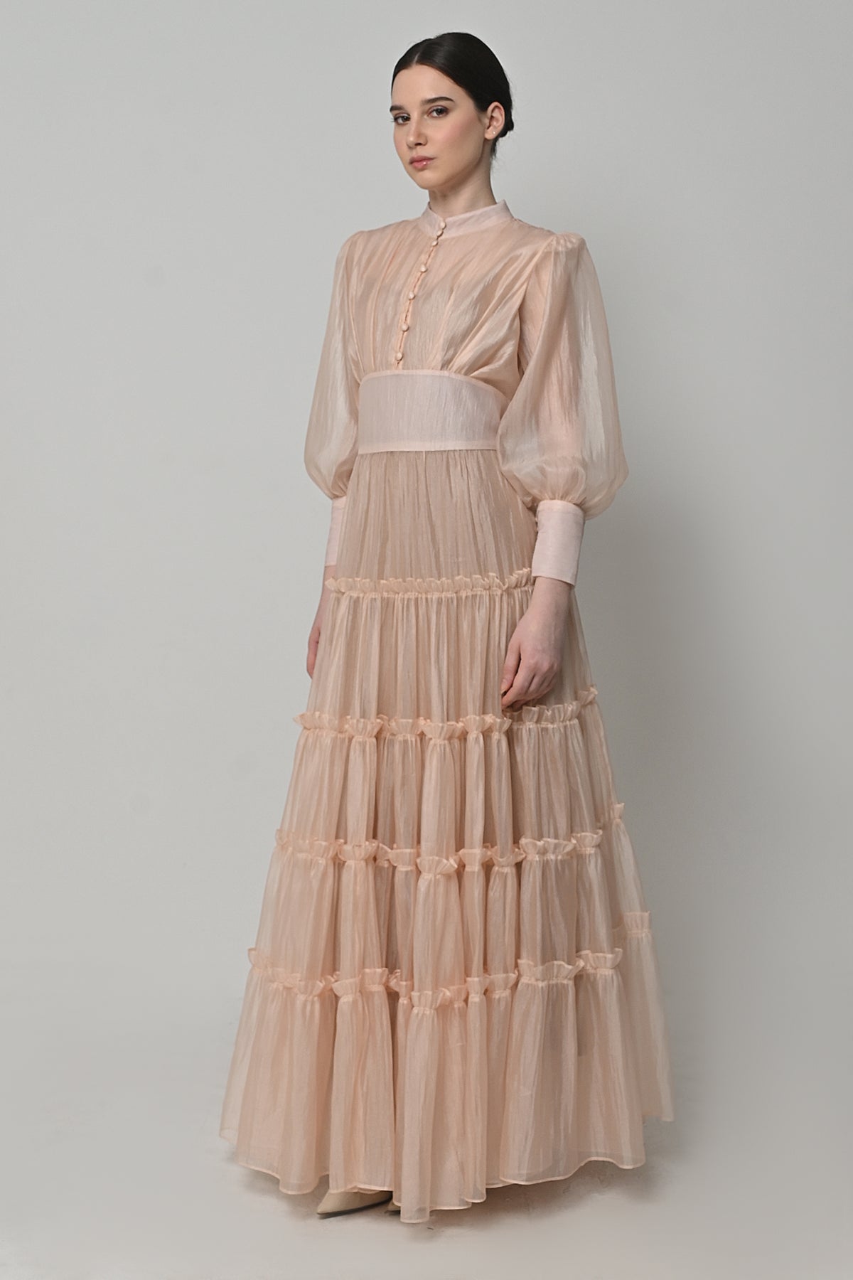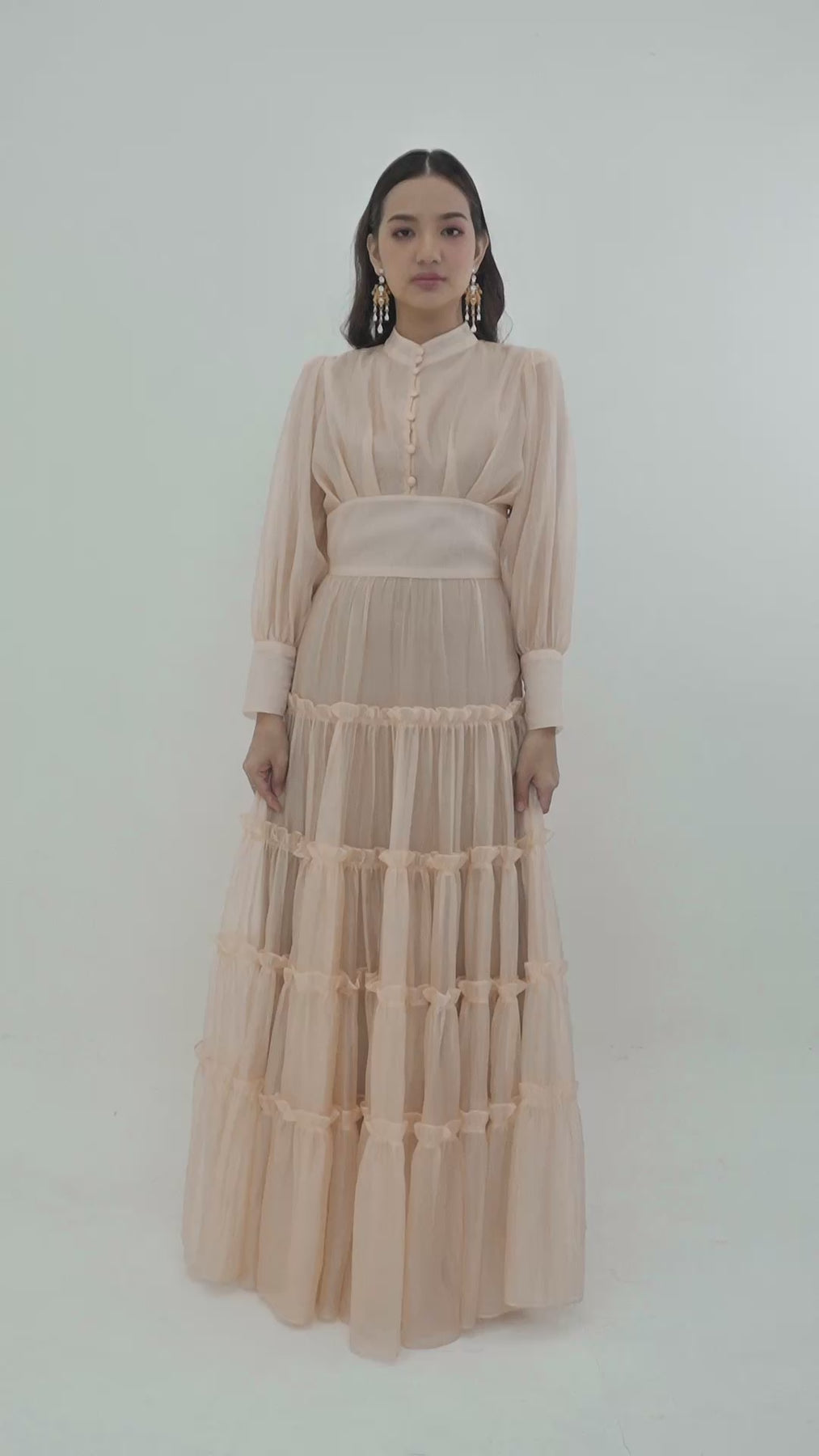 The Lalita Dress is a captivating blend of vintage charm and modern structure, presented in a shimmering, ice-blue organza fabric. This ethereal piece features a sophisticated obi-style waistband that elegantly defines the silhouette, separating a structured bodice from its flowing lower half. The design is characterized by its long sleeves with prominent cuffs, detailed with delicate buttons and built-in padding at the shoulders to create a sharp, regal posture. Completing the look is a magnificent frilled tiered skirt, where layers of ruffled organza add voluminous movement and a touch of whimsical grace.