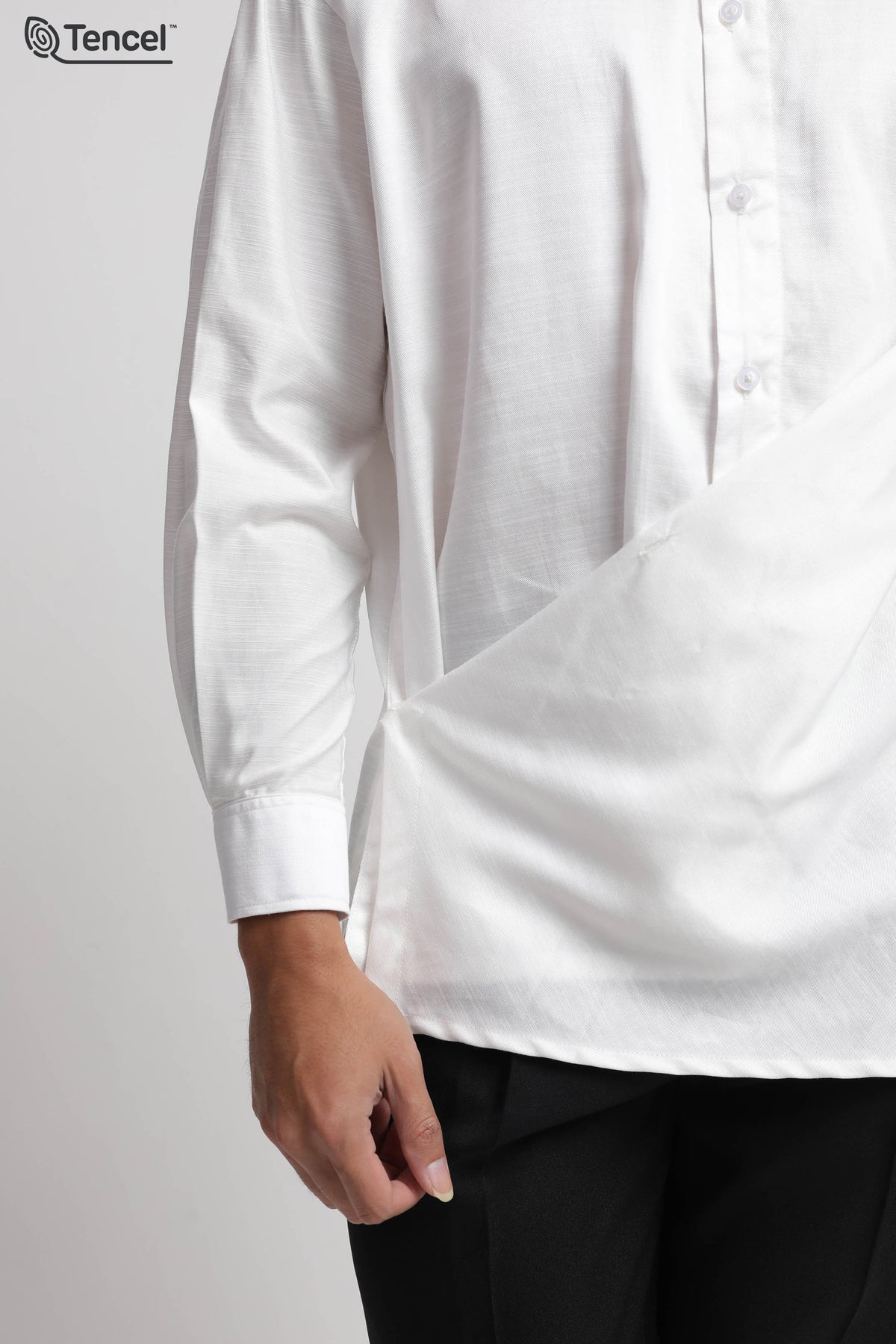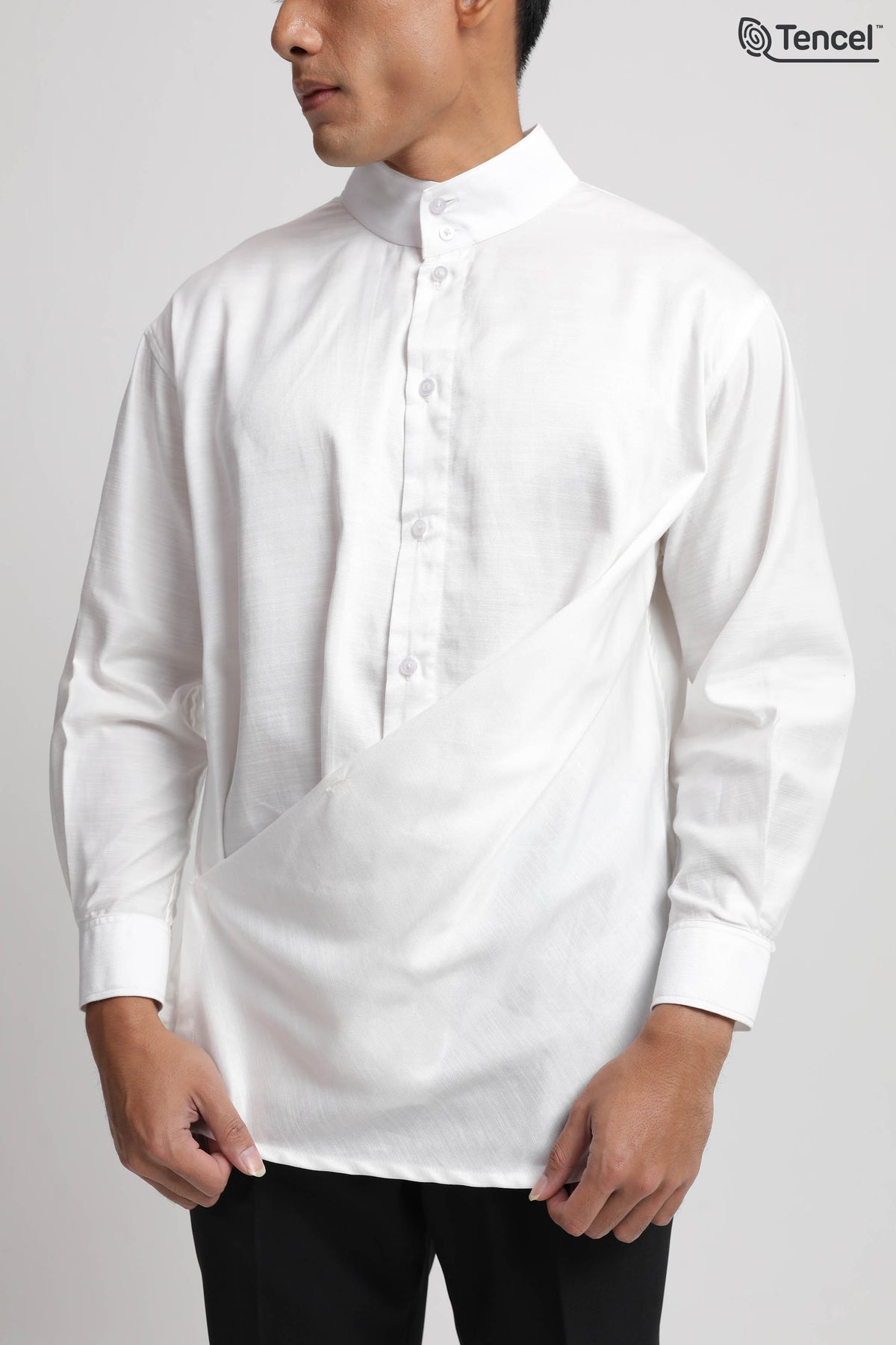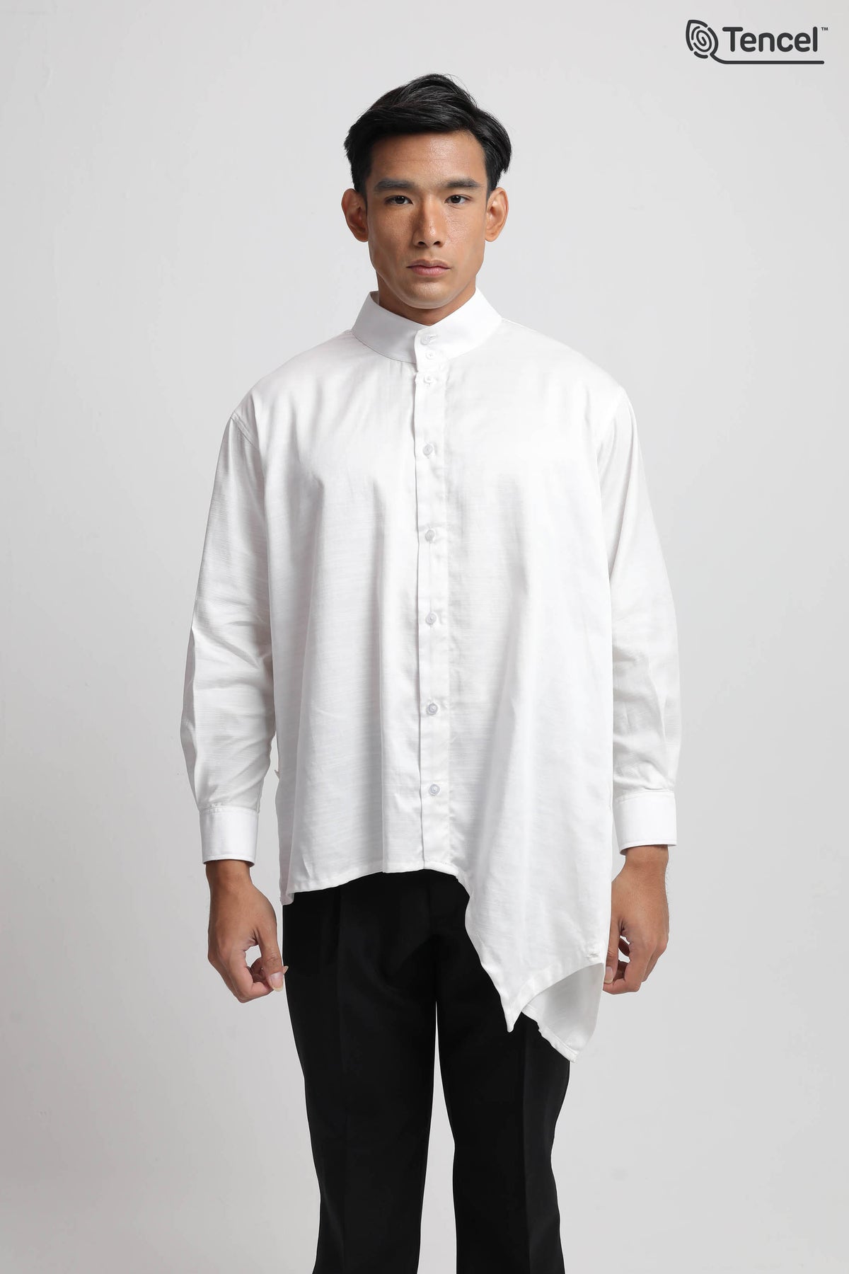 Uniqueness : Asymmetric Drape Detail, High Band Collar, Sustainable Tencel™ Fabric
