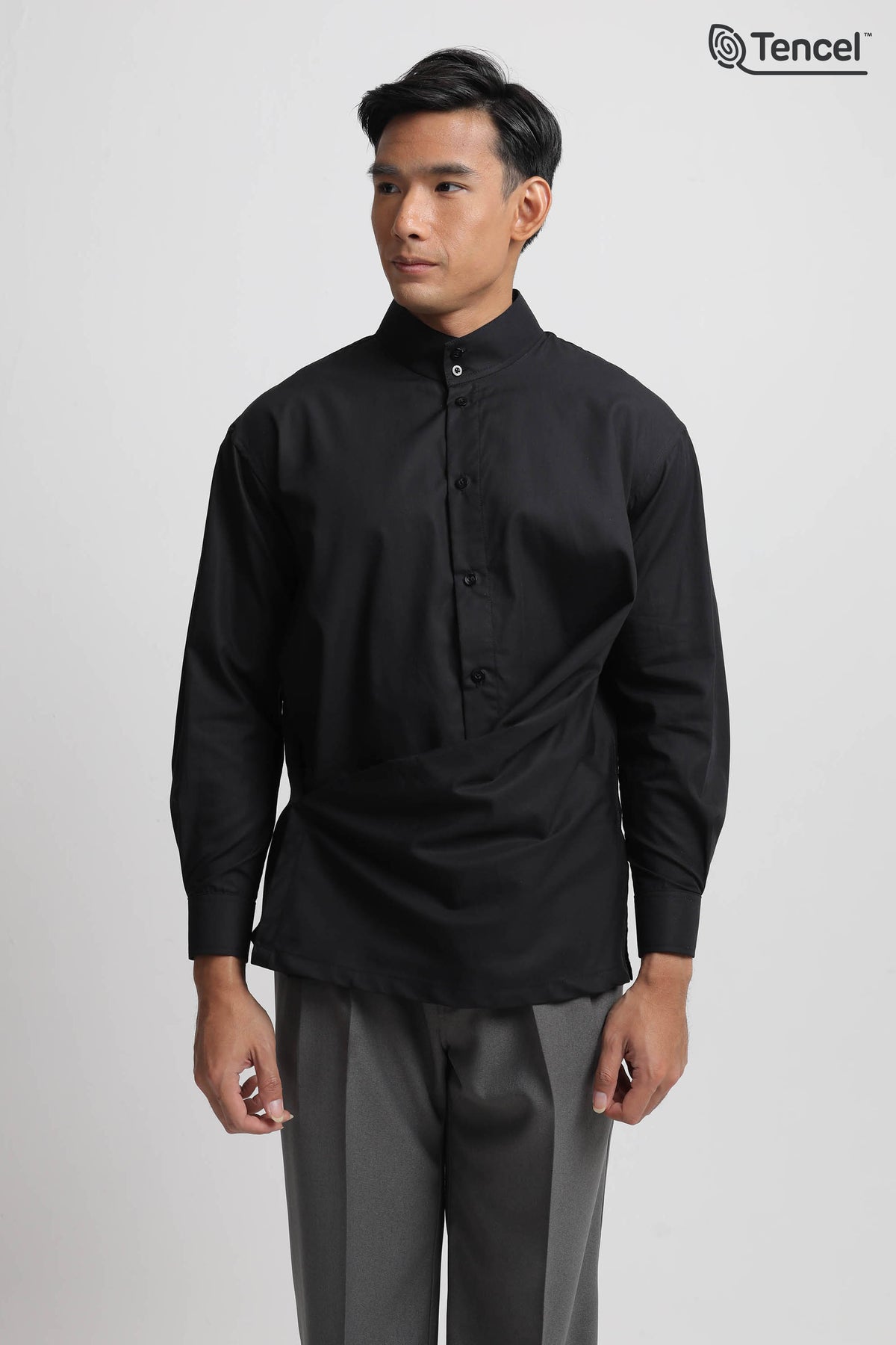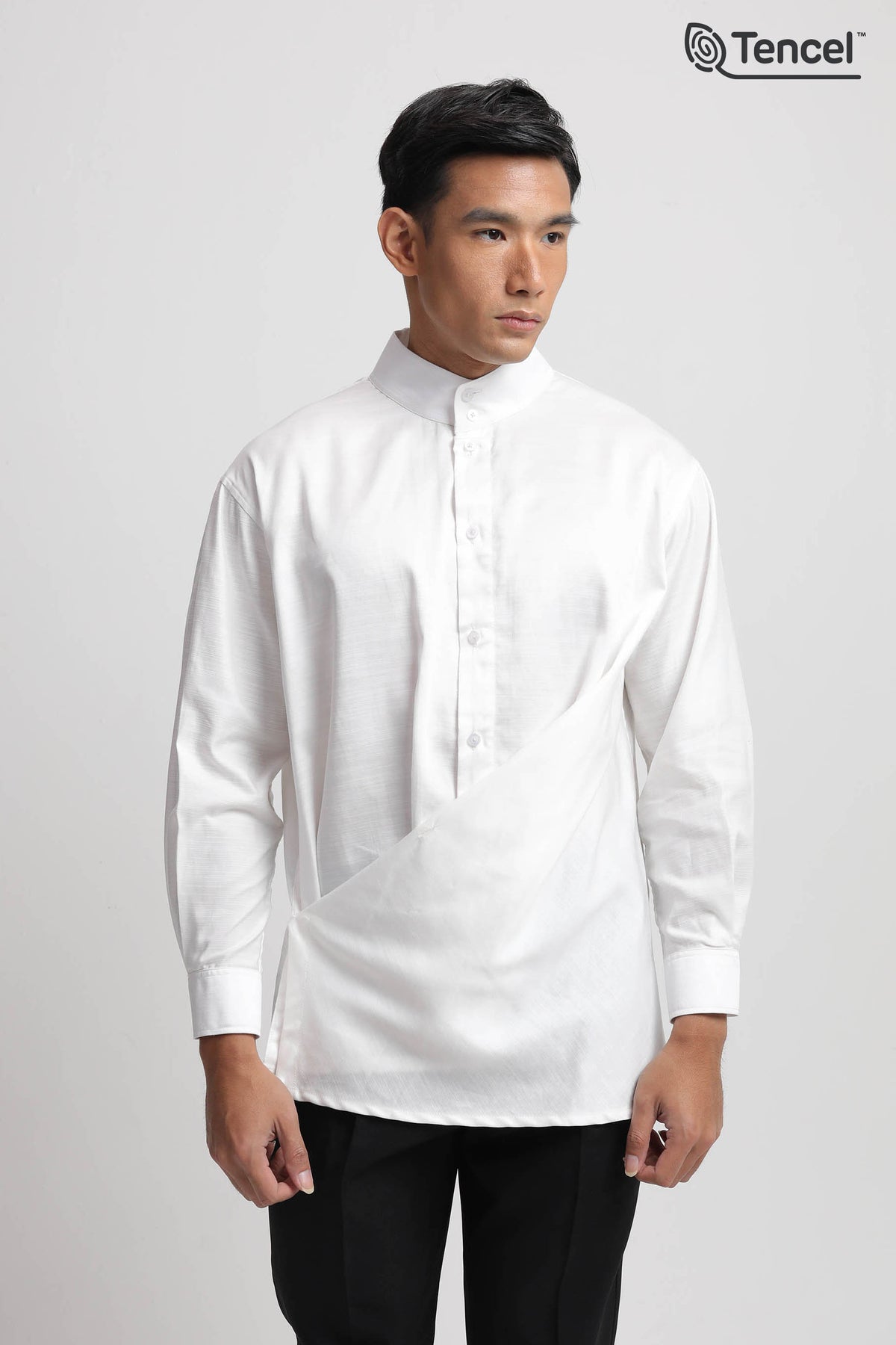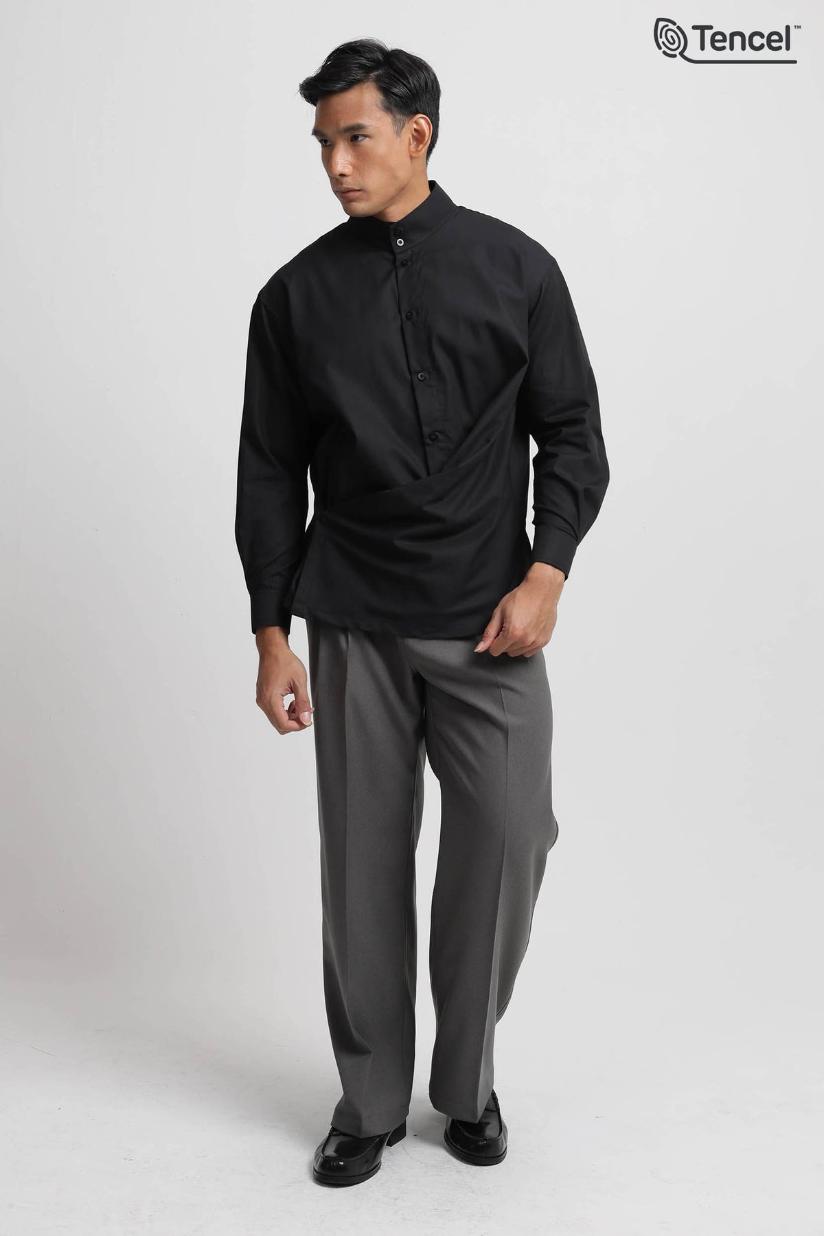 Uniqueness : Asymmetric Drape Detail, High Band Collar, Sustainable Tencel™ Fabric