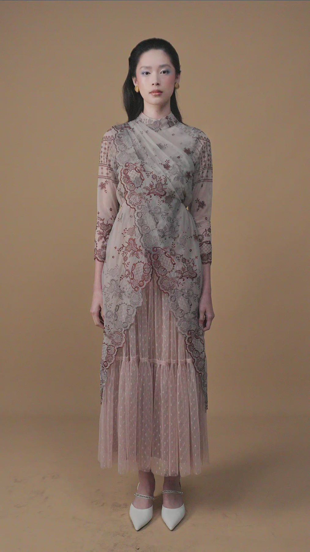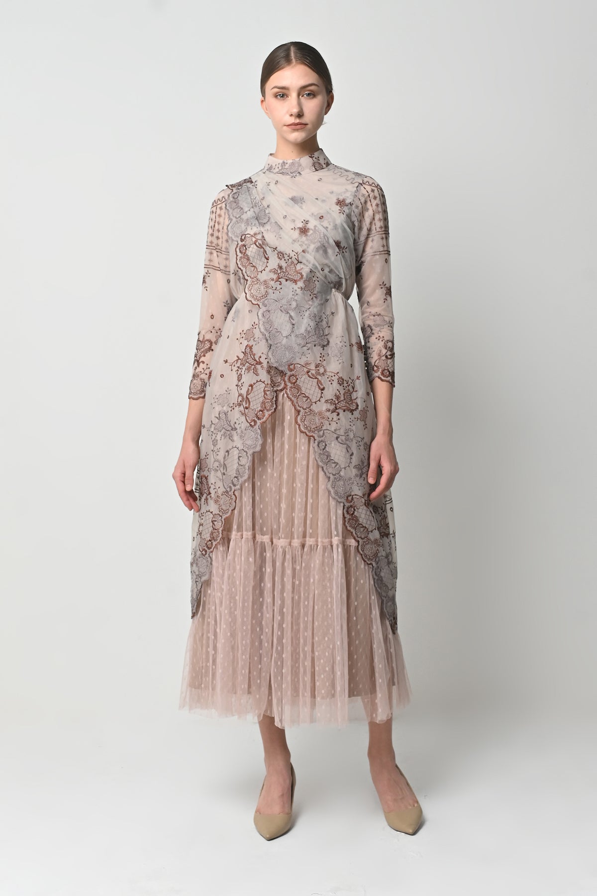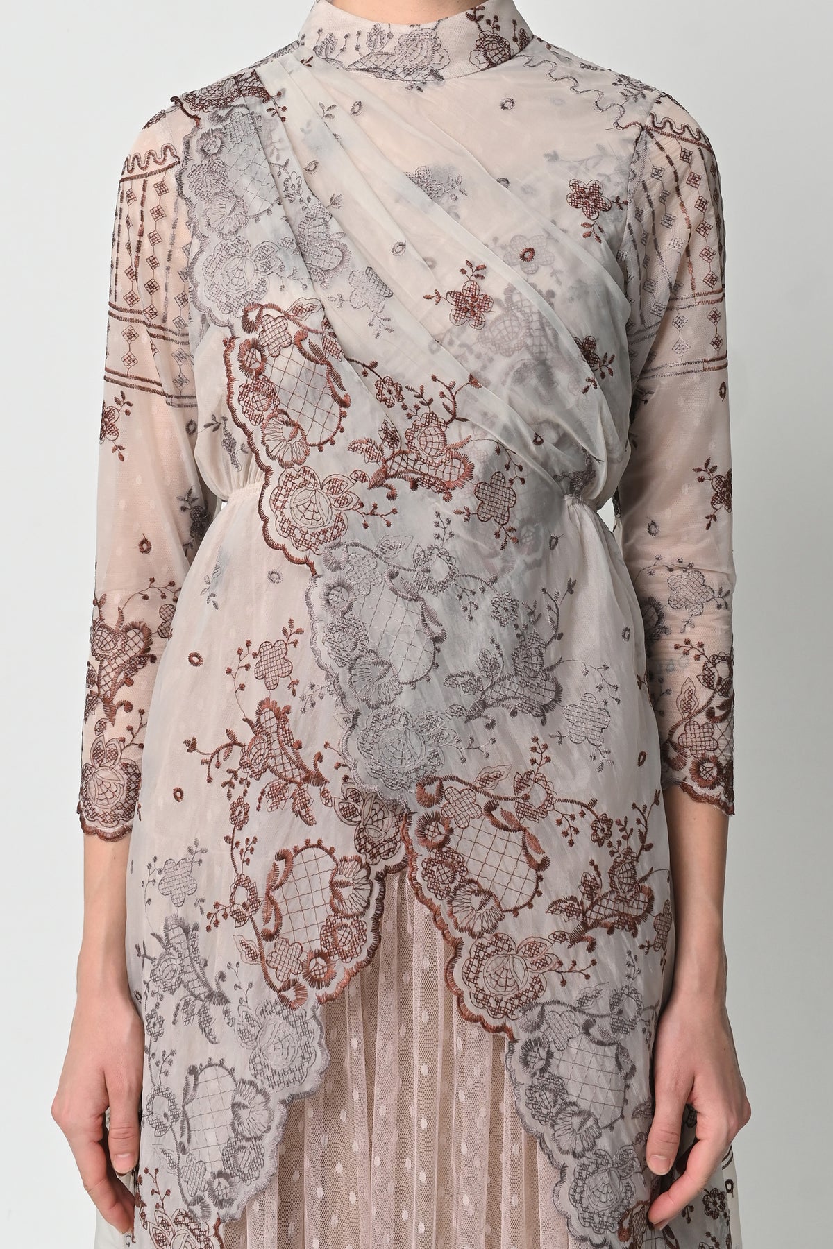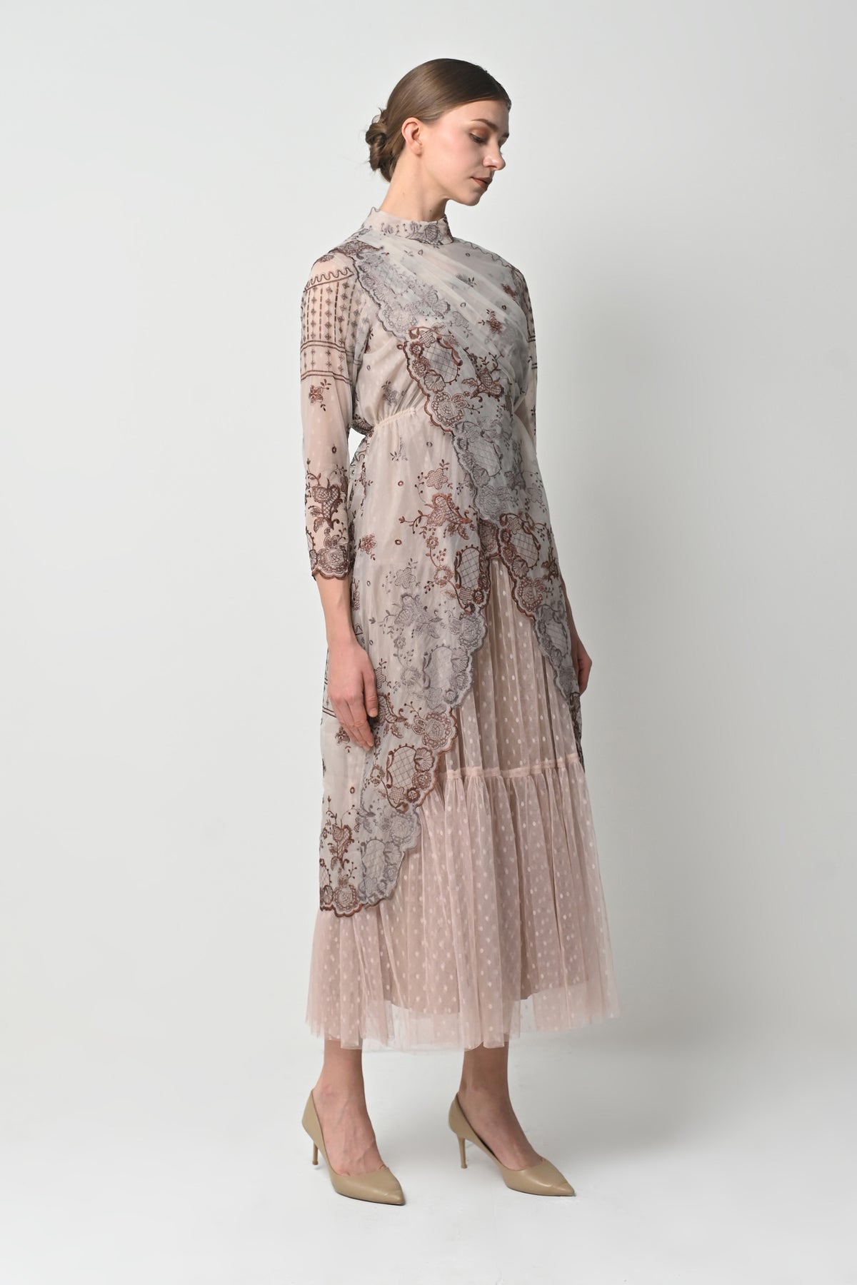 Uniqueness : The Pinna Dress is characterized by a striking asymmetrical diagonal wrap that drapes elegantly across the bodice and cascades down the side of the skirt. It is further distinguished by its dramatic Gigot sleeves and intricate brown scalloped embroidery that creates a high-contrast, artisanal finish against the delicate beige polkadot tulle.