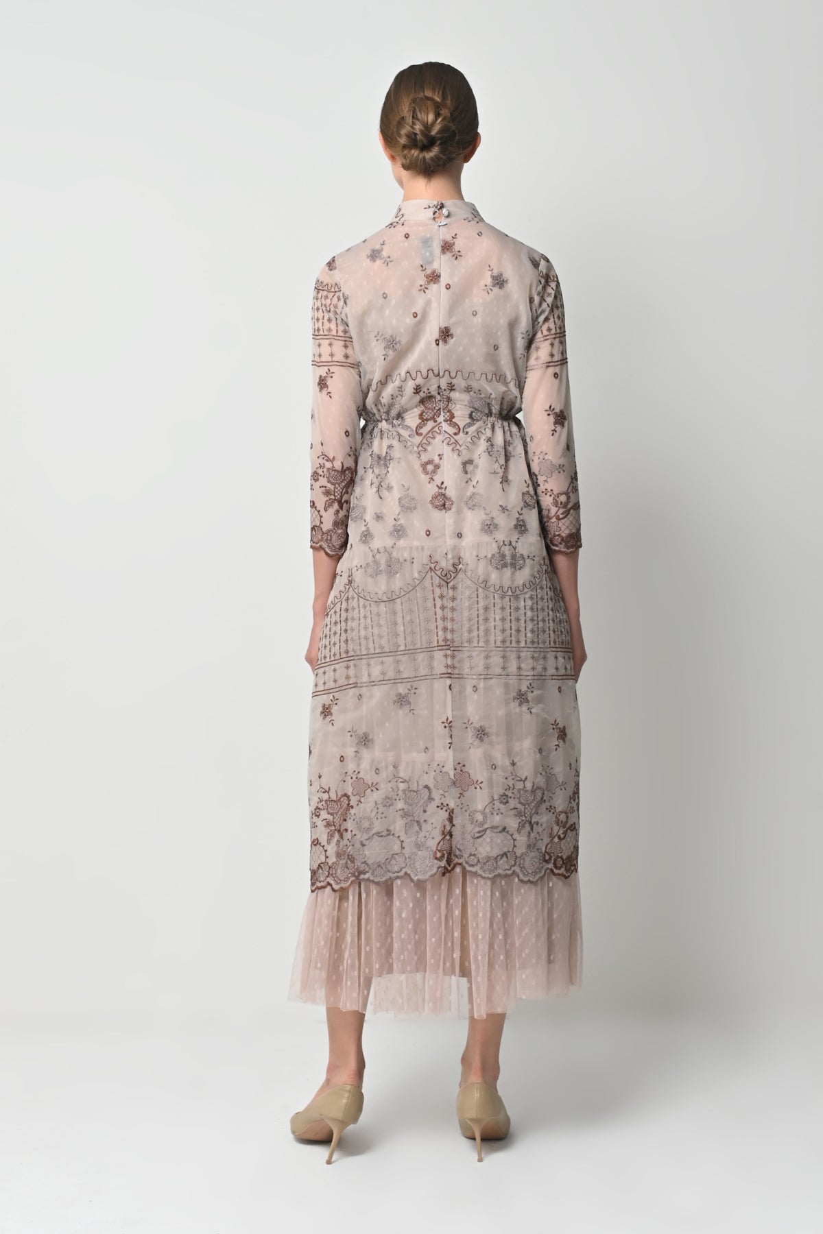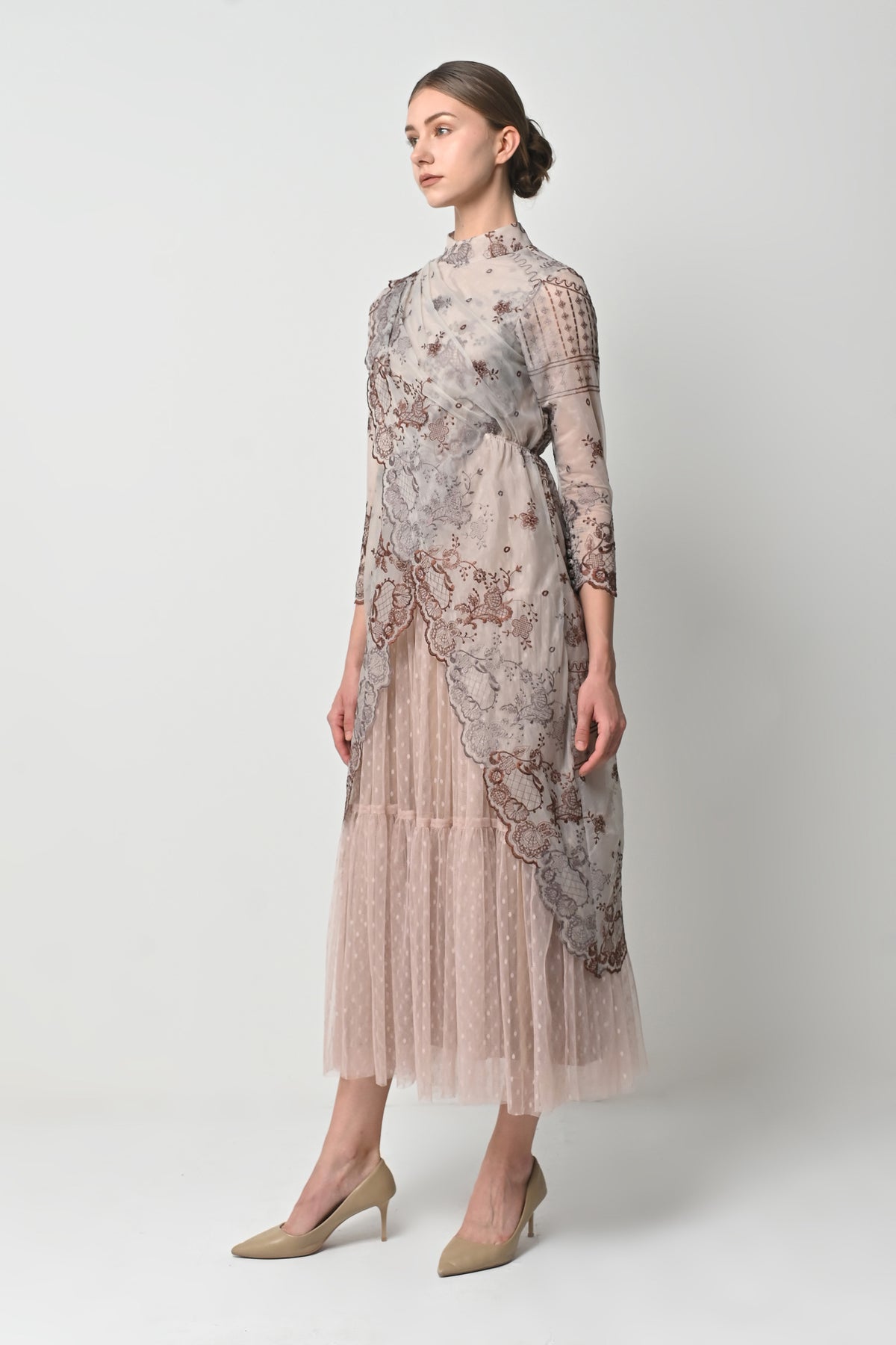 The Pinna Dress is a sophisticated long-sleeve maxi dress that blends modern architectural draping with romantic, vintage-inspired details. It is defined by a striking asymmetrical wrap overlay that sweeps diagonally across the bodice and cascades down the side of the A-line skirt, all meticulously finished with intricate brown scalloped embroidery. This fit-and-flare silhouette features a classic Shanghai collar, a row of delicate fabric-covered buttons, and dramatic Gigot sleeves that are puffed at the shoulder and tapered at the wrist. Crafted from a sheer combination of brown floral organza and beige polkadot tulle, this unlined dress offers an ethereal and luxurious look designed for creative formal layering.