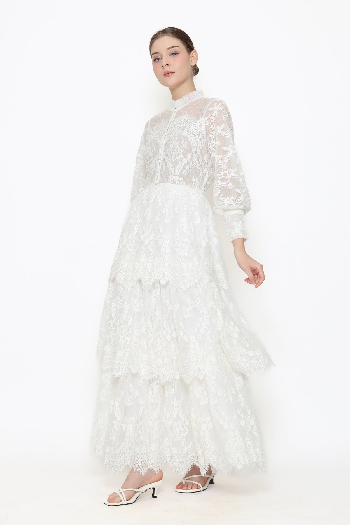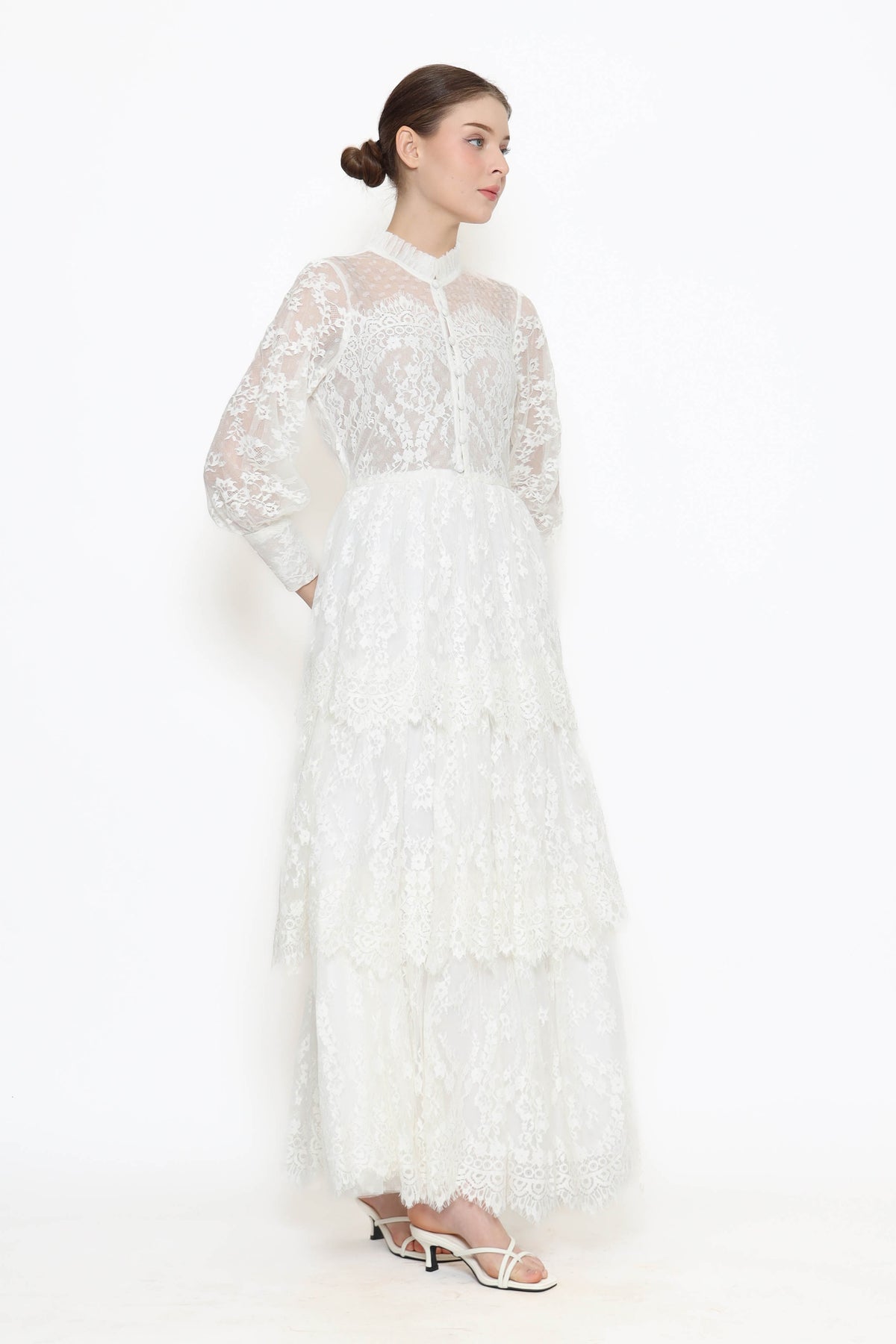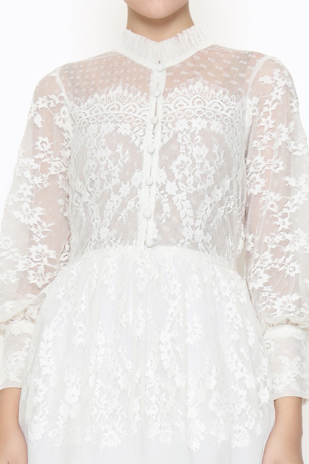 Indulge in the romantic charm of the Kalula Dress in White. With its delicate lace and tulle dot material, this Long Sleeve Maxi Dress exudes sophistication and elegance. The Fit and Flare cut flatters your figure while the sheer and see-through design adds a touch of allure. Featuring a Victorian Collar and Bishop Sleeves with Cuffs, this dress is finished with a unique Yoke Tulle Cutout and a tiered skirt. Perfect for any occasion, this dress will surely turn heads.