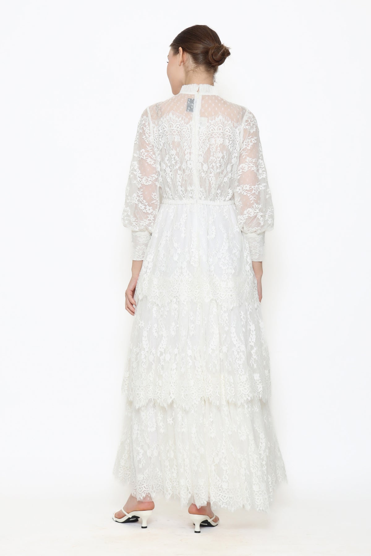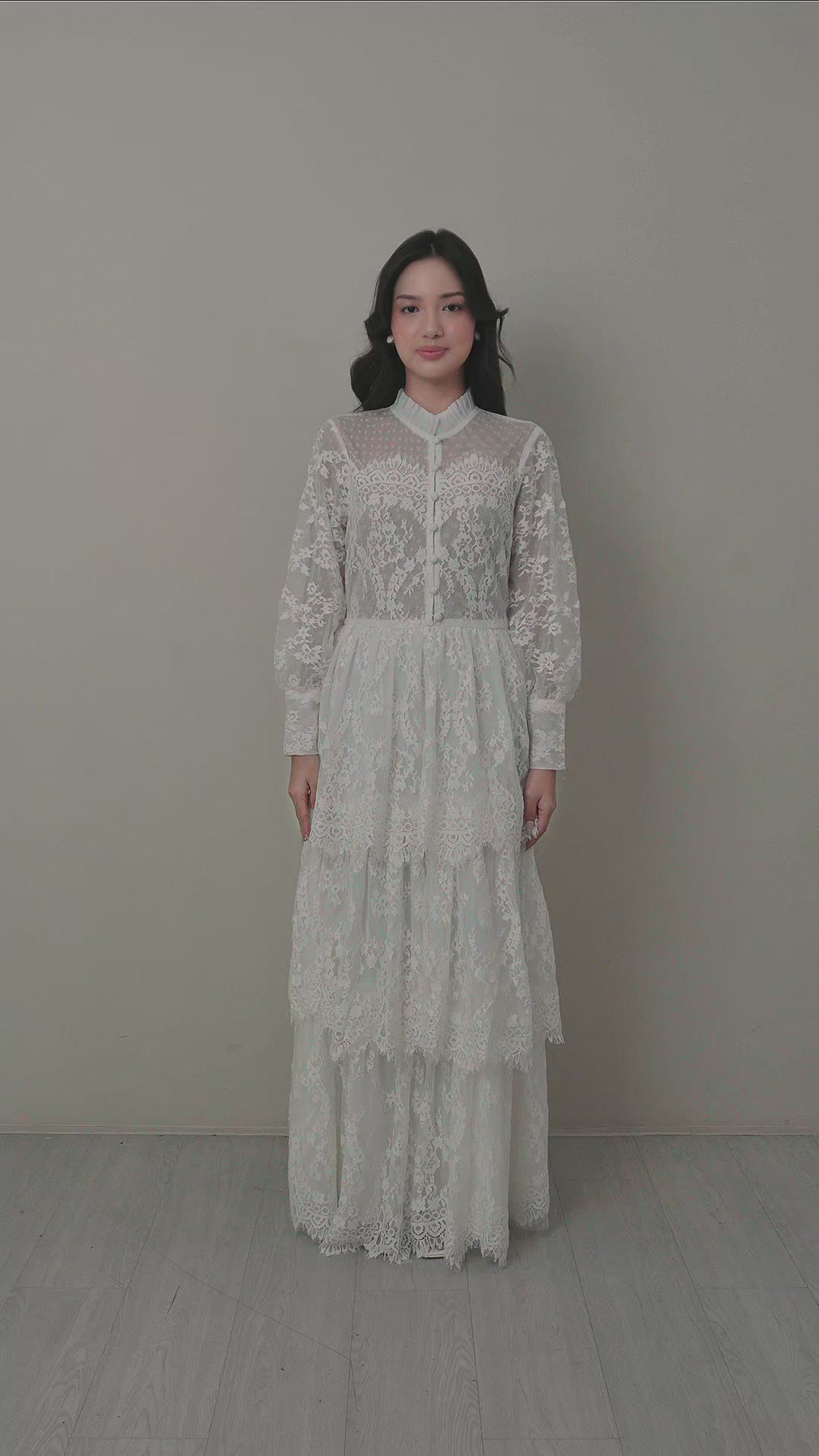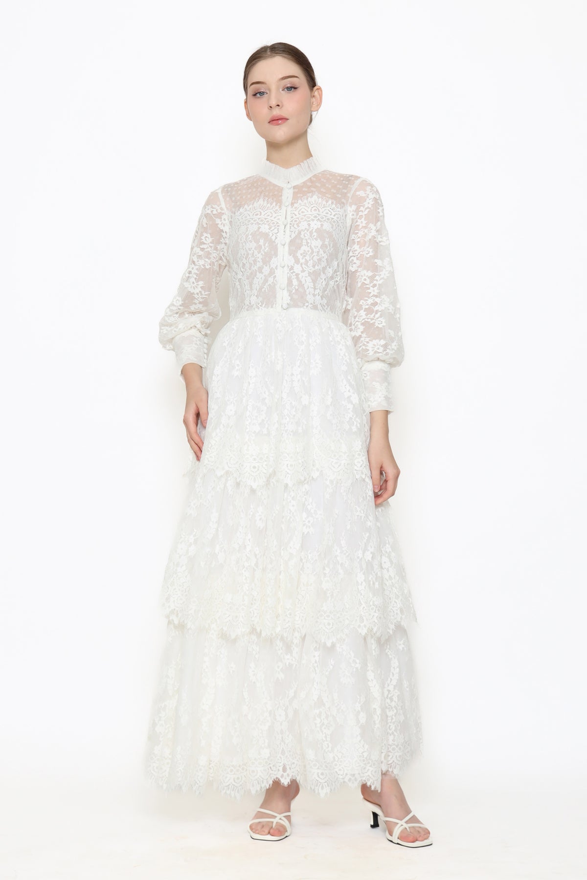 Indulge in the romantic charm of the Kalula Dress in White. With its delicate lace and tulle dot material, this Long Sleeve Maxi Dress exudes sophistication and elegance. The Fit and Flare cut flatters your figure while the sheer and see-through design adds a touch of allure. Featuring a Victorian Collar and Bishop Sleeves with Cuffs, this dress is finished with a unique Yoke Tulle Cutout and a tiered skirt. Perfect for any occasion, this dress will surely turn heads.
