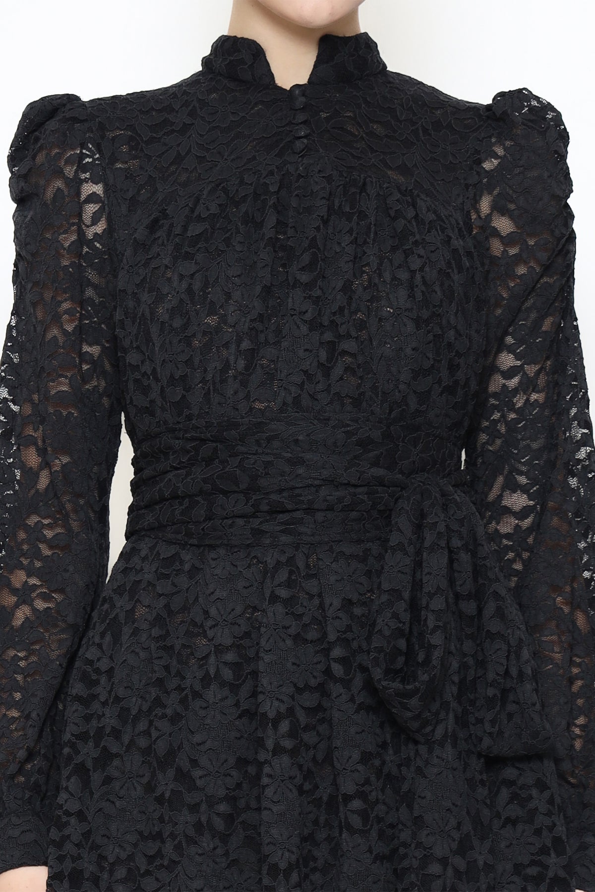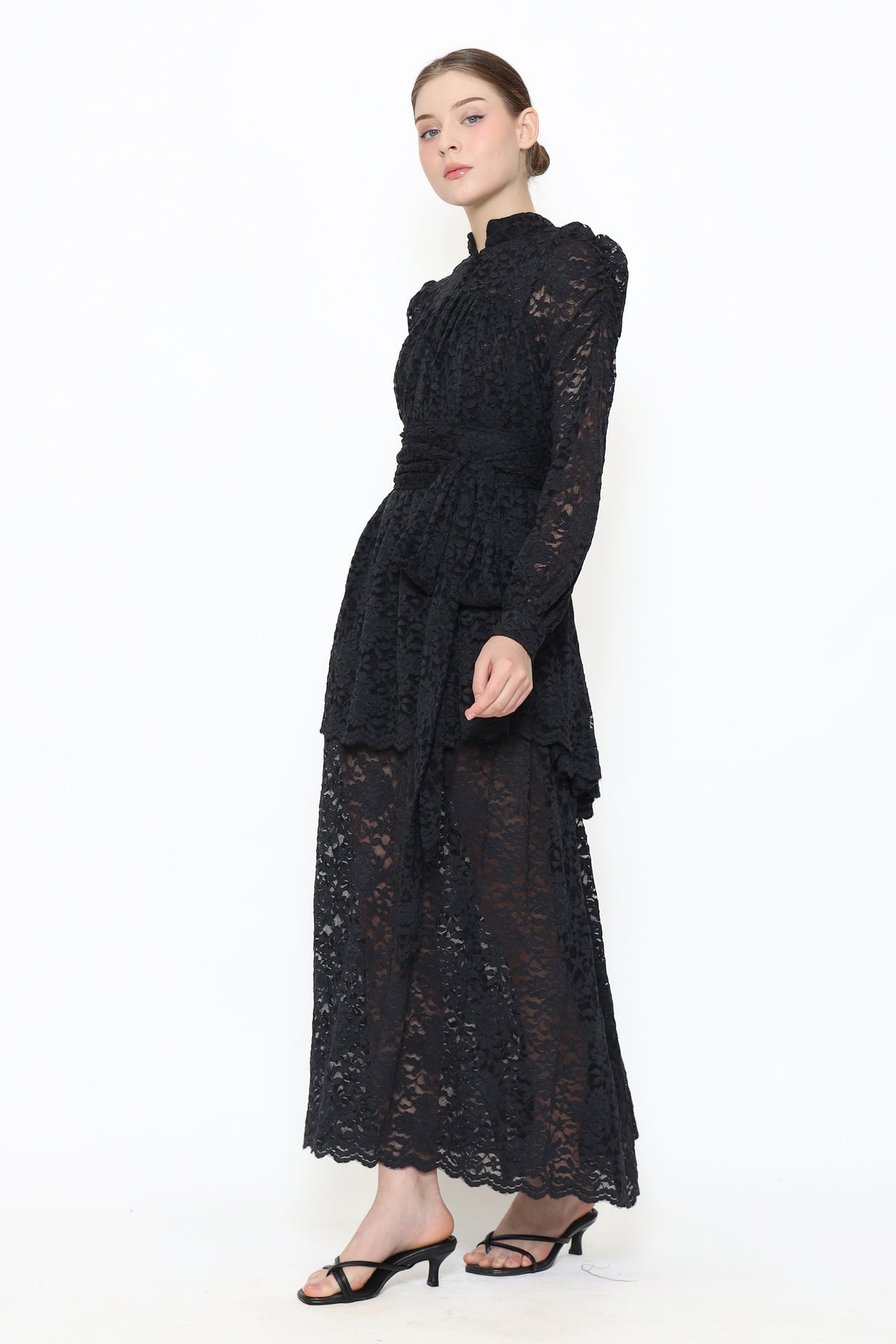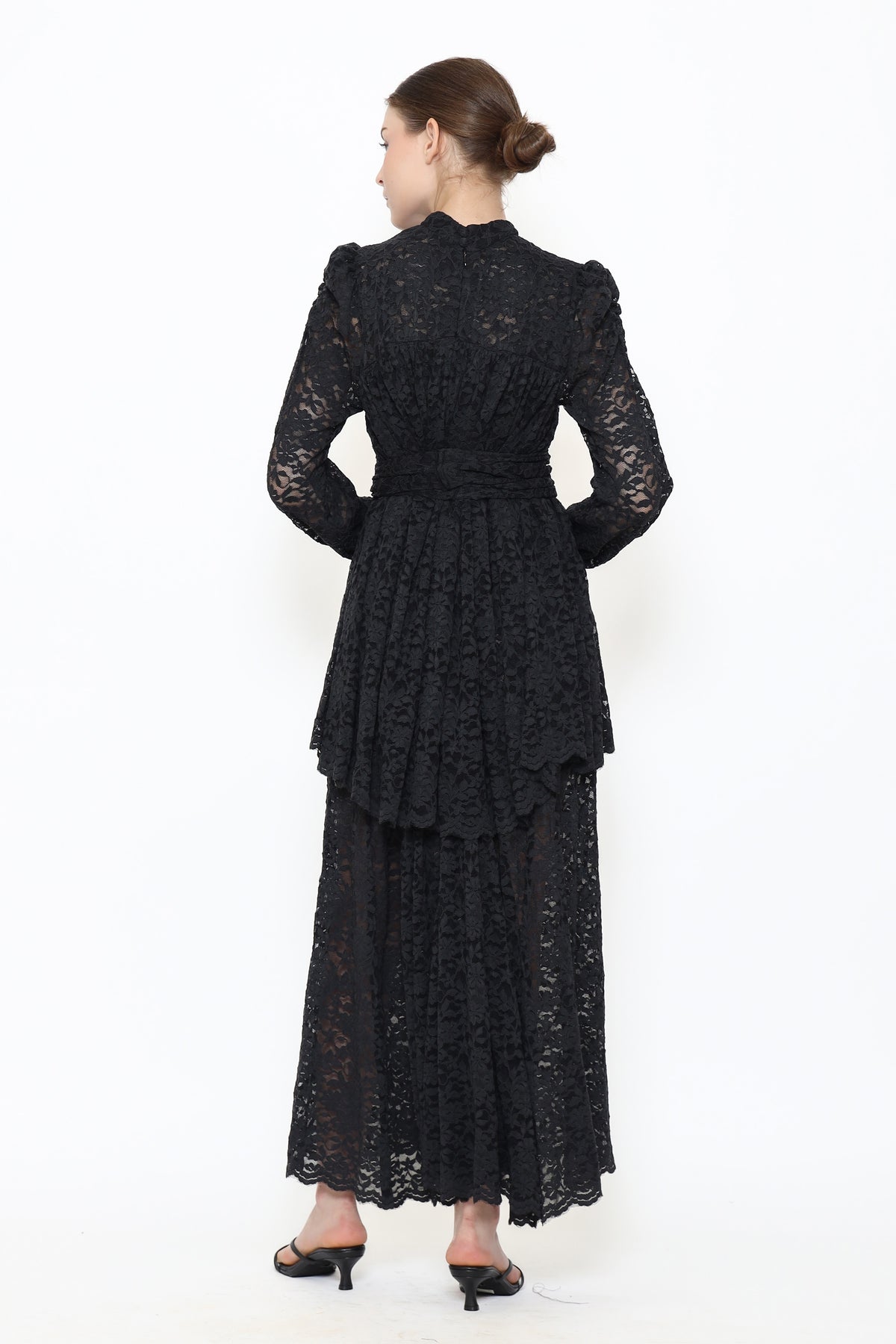 This black lace ensemble stands out for its sophisticated blend of Victorian-inspired modesty and modern versatility, featuring an elegant high-collared neckline and structured puff shoulders that frame a unique tiered silhouette. The design is particularly distinctive because it functions as a modular piece; it can be worn as a fluid, architectural smock for a contemporary look or cinched with its matching lace sash to create a classic hourglass shape, all while utilizing delicate scalloped edges and a play on transparency to keep the floor-length aesthetic feeling light and high-fashion.