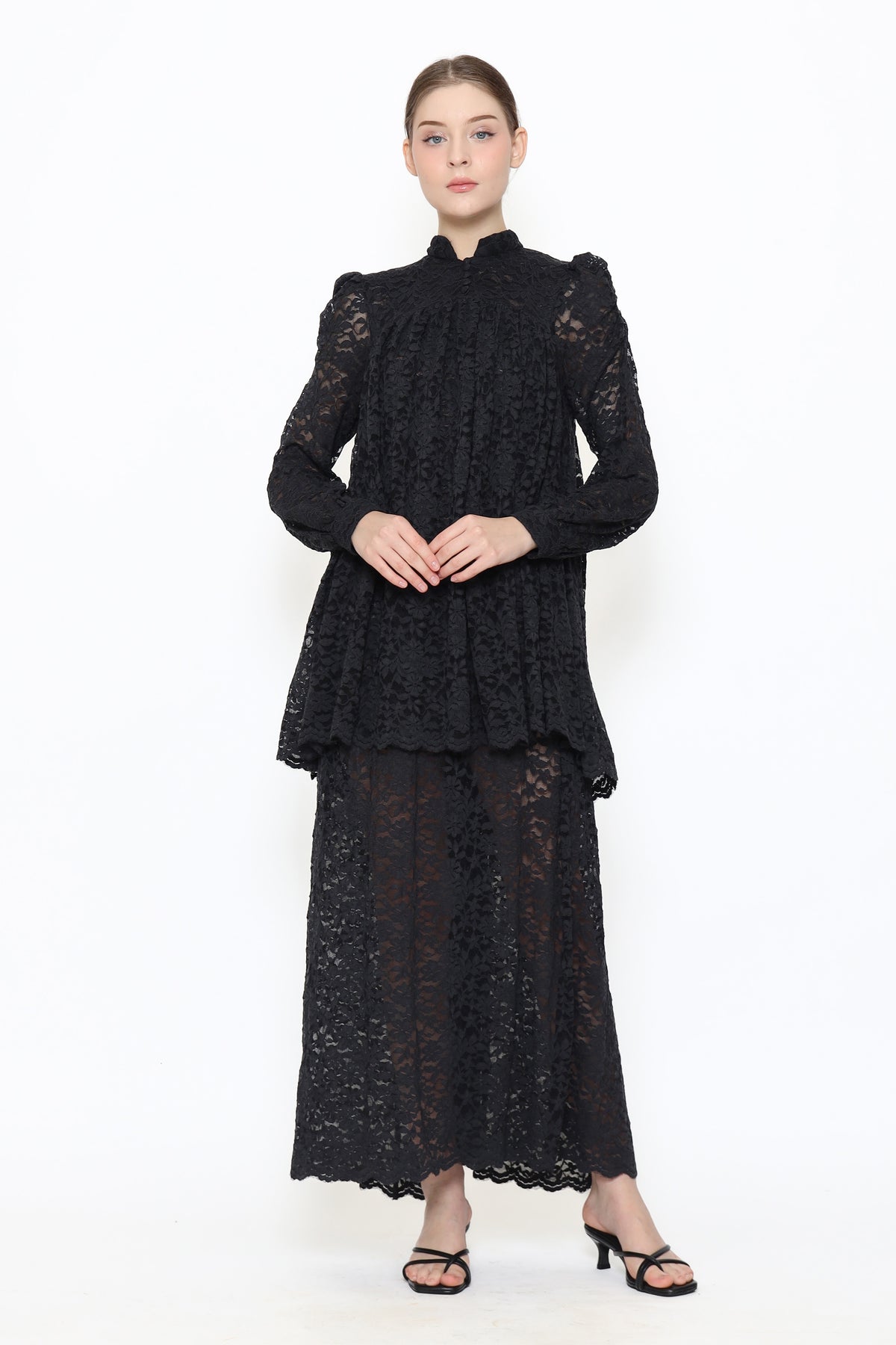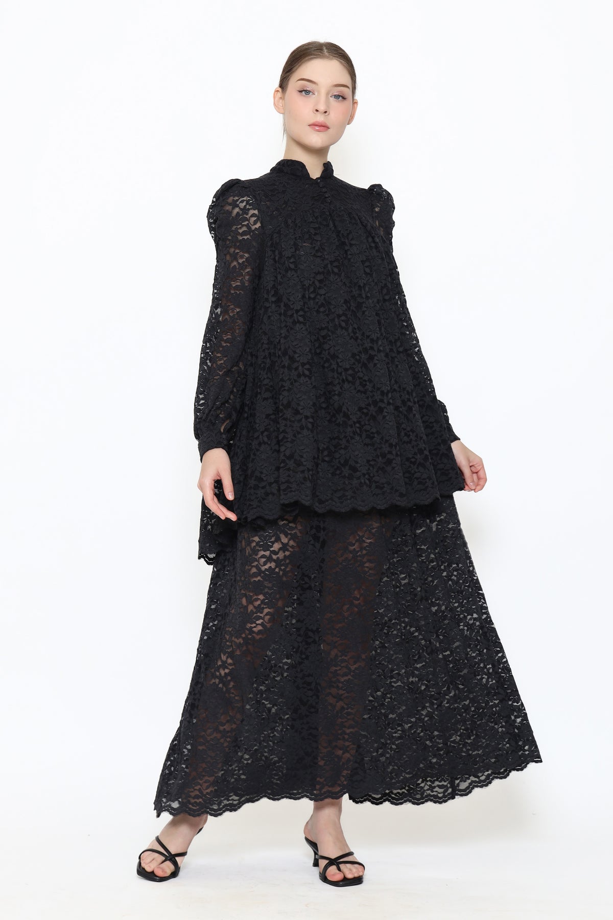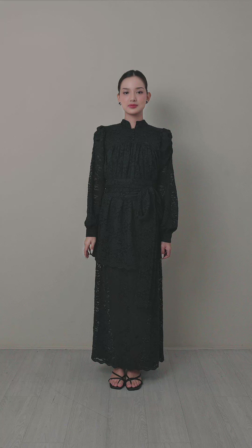 This black lace ensemble stands out for its sophisticated blend of Victorian-inspired modesty and modern versatility, featuring an elegant high-collared neckline and structured puff shoulders that frame a unique tiered silhouette. The design is particularly distinctive because it functions as a modular piece; it can be worn as a fluid, architectural smock for a contemporary look or cinched with its matching lace sash to create a classic hourglass shape, all while utilizing delicate scalloped edges and a play on transparency to keep the floor-length aesthetic feeling light and high-fashion.