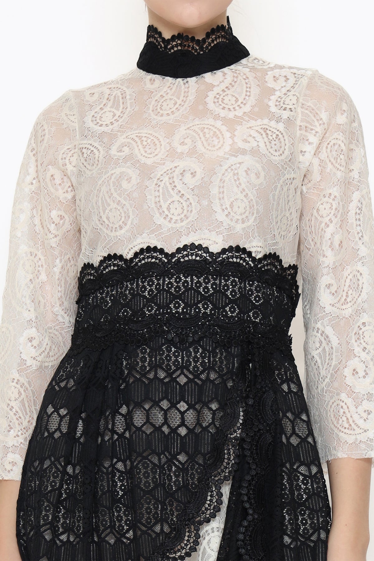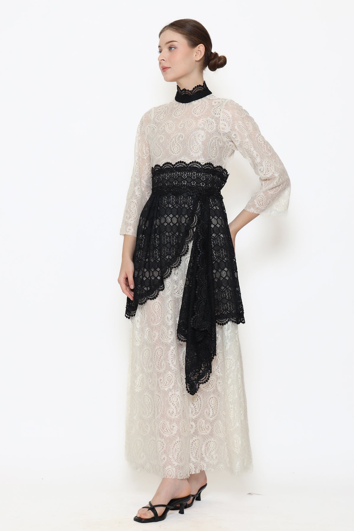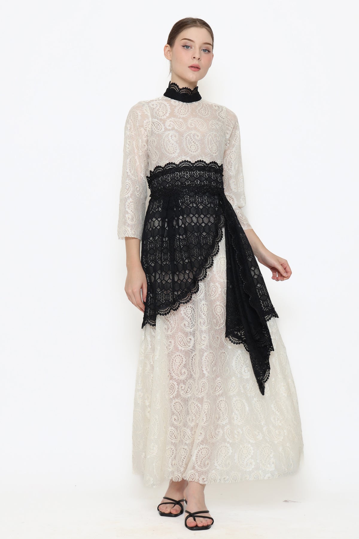 Fall in love with the stunning Lucia Dress! This long sleeve maxi dress features a beautiful lace material in white and black. The loose fit and sheer transparency add a touch of elegance. The A-Line dress is cinched at the natural waistline with a ribbon, while the imperial collar and straight sleeves add a unique touch. Don't miss the details of drapery on the skirt. A true statement piece for your wardrobe!