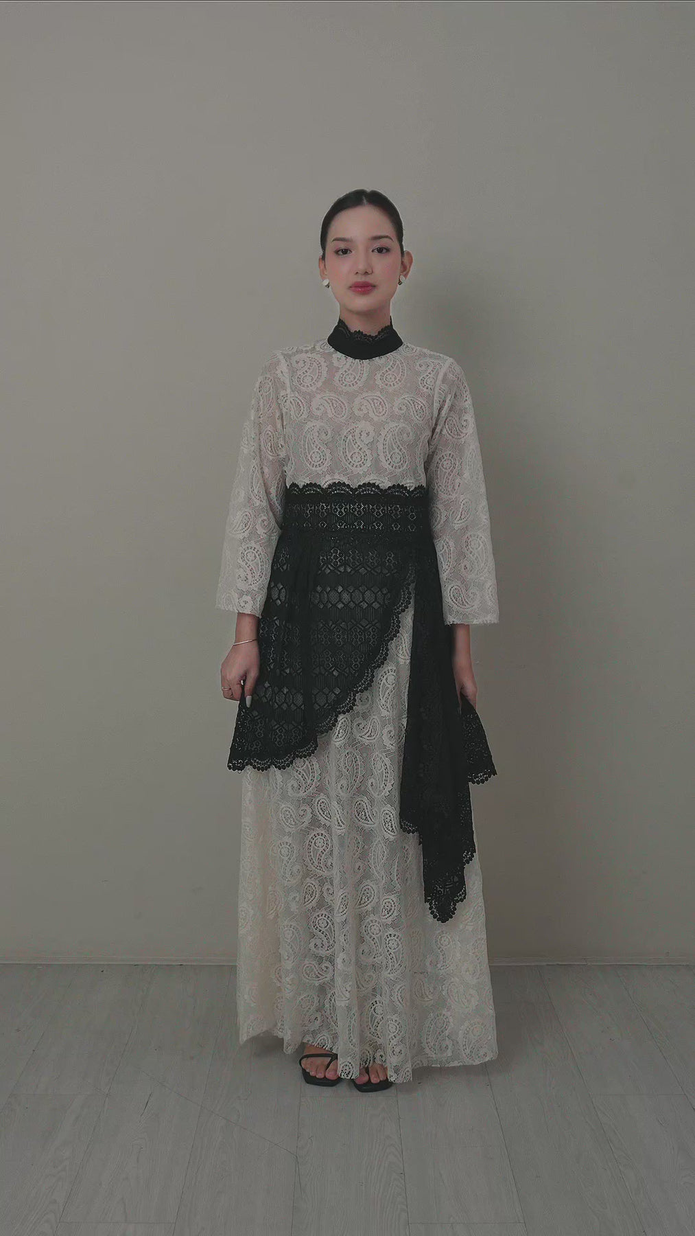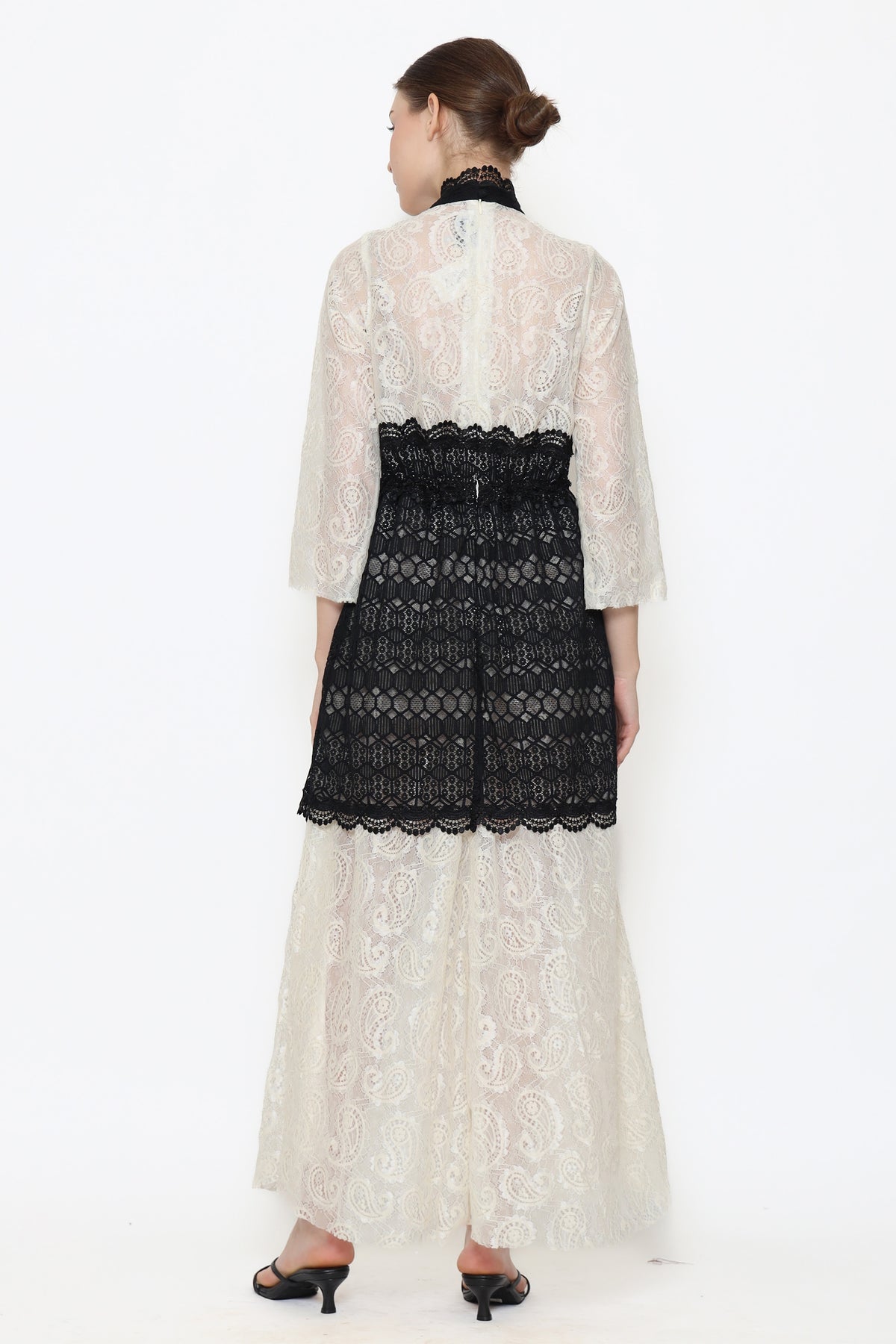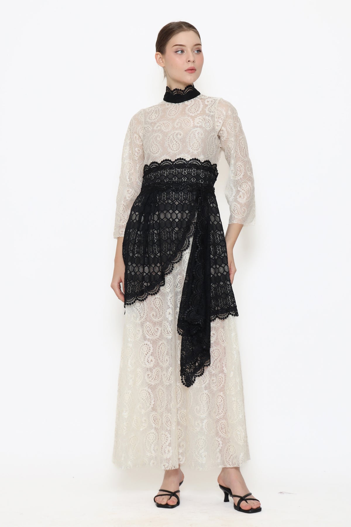 Fall in love with the stunning Lucia Dress! This long sleeve maxi dress features a beautiful lace material in white and black. The loose fit and sheer transparency add a touch of elegance. The A-Line dress is cinched at the natural waistline with a ribbon, while the imperial collar and straight sleeves add a unique touch. Don't miss the details of drapery on the skirt. A true statement piece for your wardrobe!
