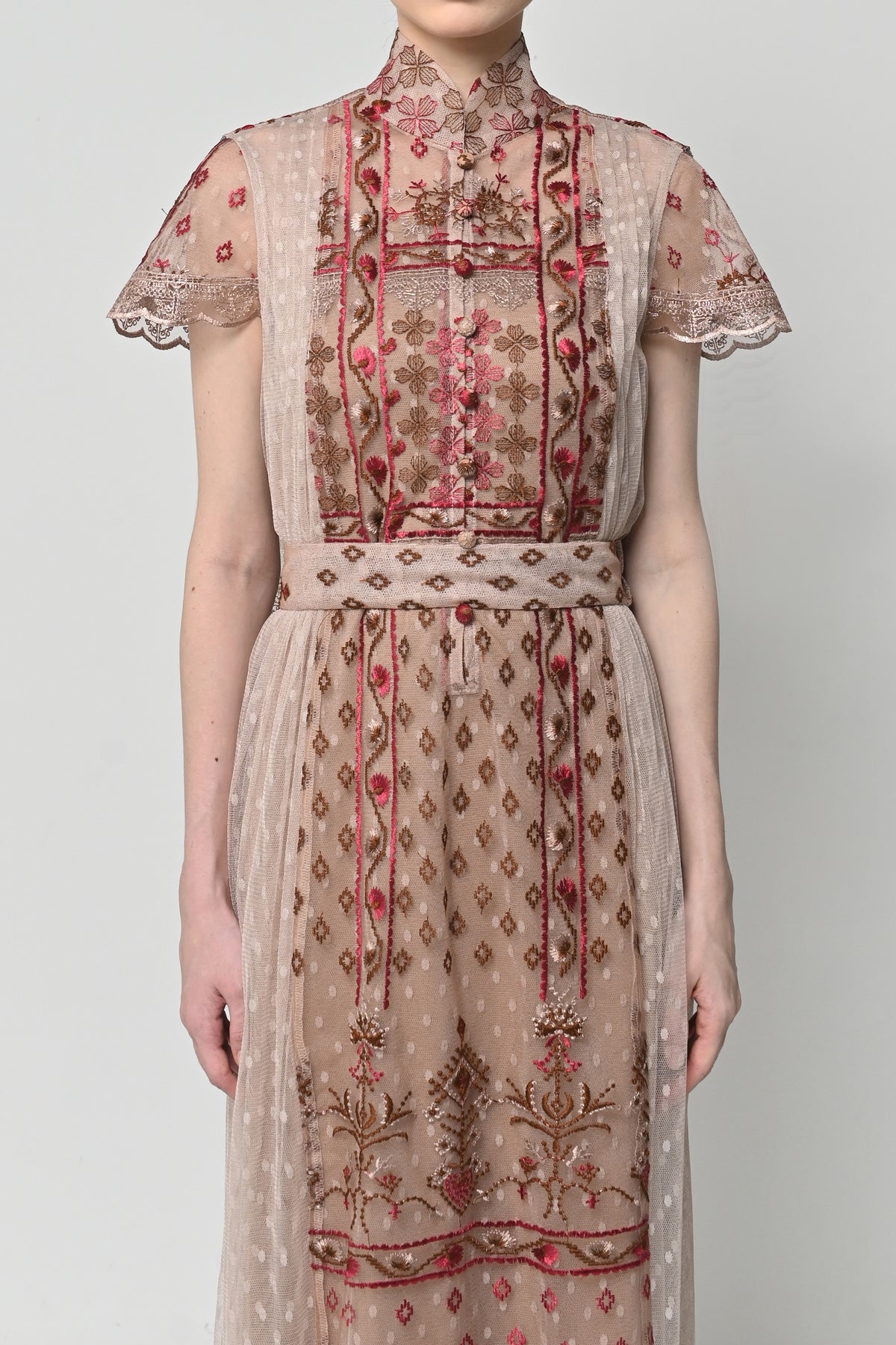 In terms of construction, the dress showcases meticulous craftsmanship through its precise paneling and embroidery placement. The embroidery is carefully aligned along the seams, ensuring a harmonious visual continuity throughout the garment. The tulle overlay is cleanly finished with fine hemming, while the inner lining is cut to follow the natural drape of the outer fabric, allowing comfortable movement. Each stitch reinforces the dress’s luxurious finish — a seamless blend of technical precision and graceful artistry.