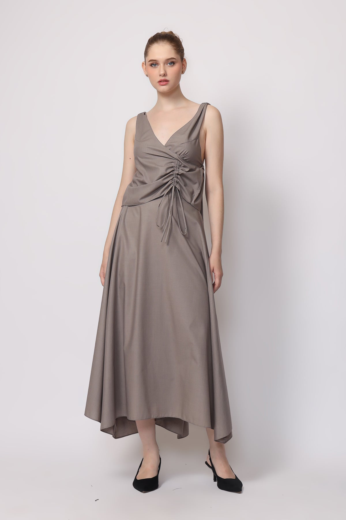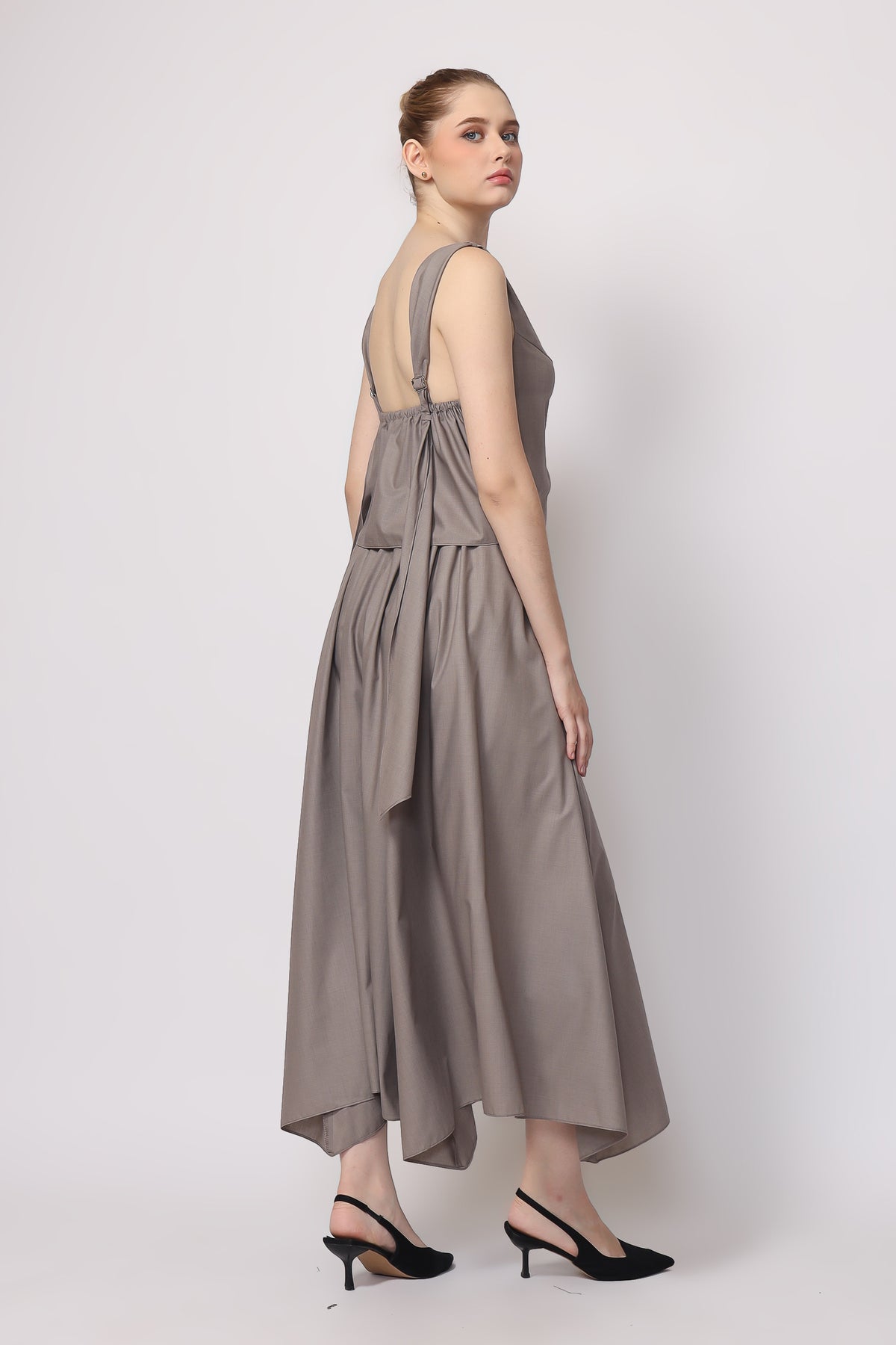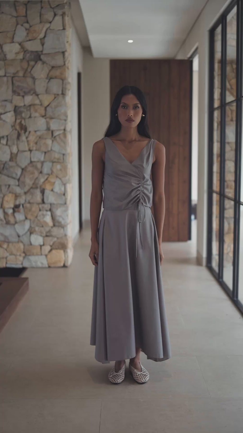 Falling into a graceful A-line skirt with a slightly asymmetric hem, the Linda Dress moves fluidly with every step. Its muted grey tone exudes understated sophistication, allowing easy styling for both casual chic and semi-formal occasions. A timeless piece that balances minimalism with modern femininity.